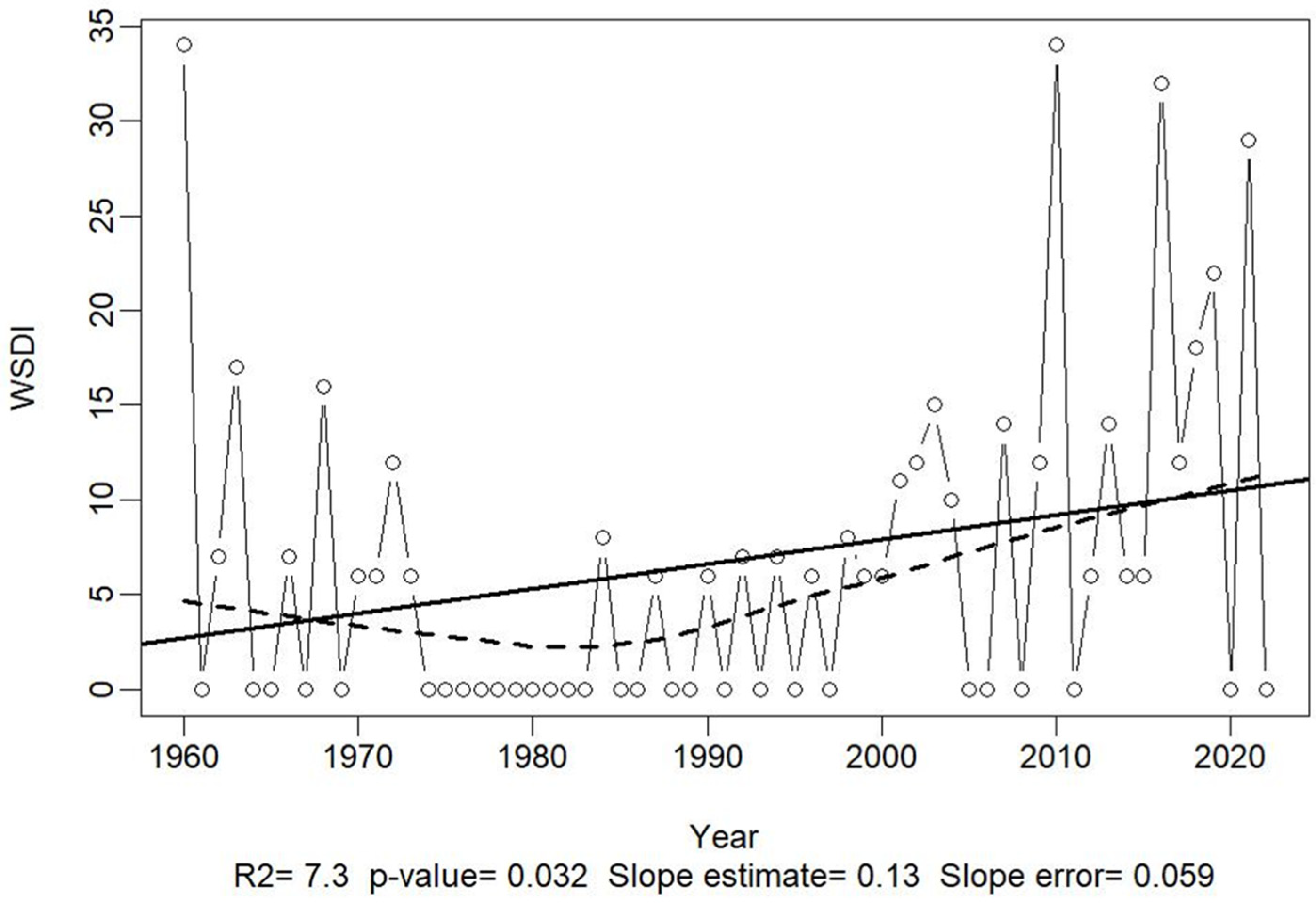 | WSDI | Warm Spell Duration Index—Days within warm spells ≥ 6 days with Tmax > 90th percentile |