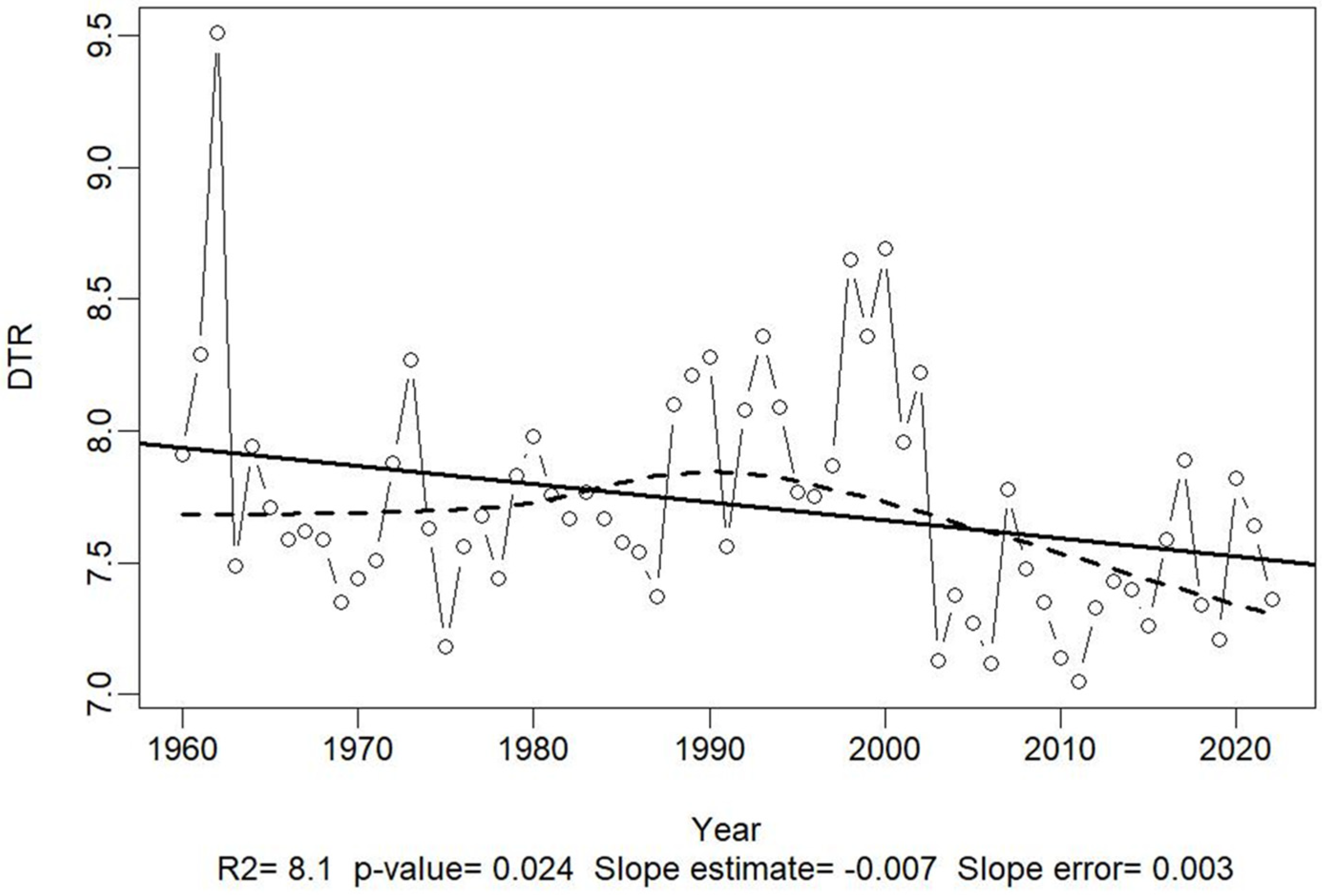 | DTR | Diurnal Temperature Range—Daily temperature range: Tmax—Tmin |