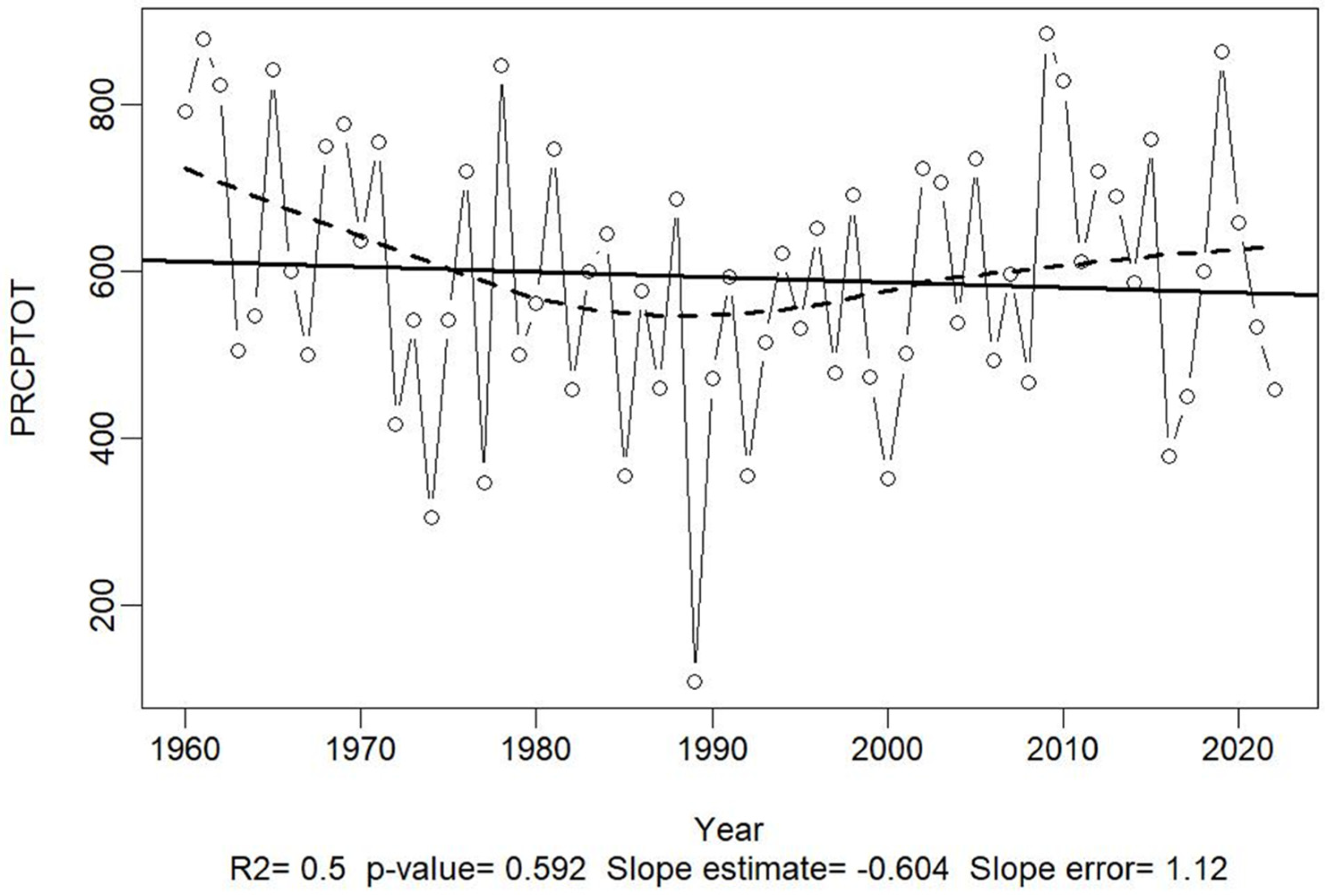 | PRCPTOT | Annual total precipitation | ↓ (slight) | Potential water stress |