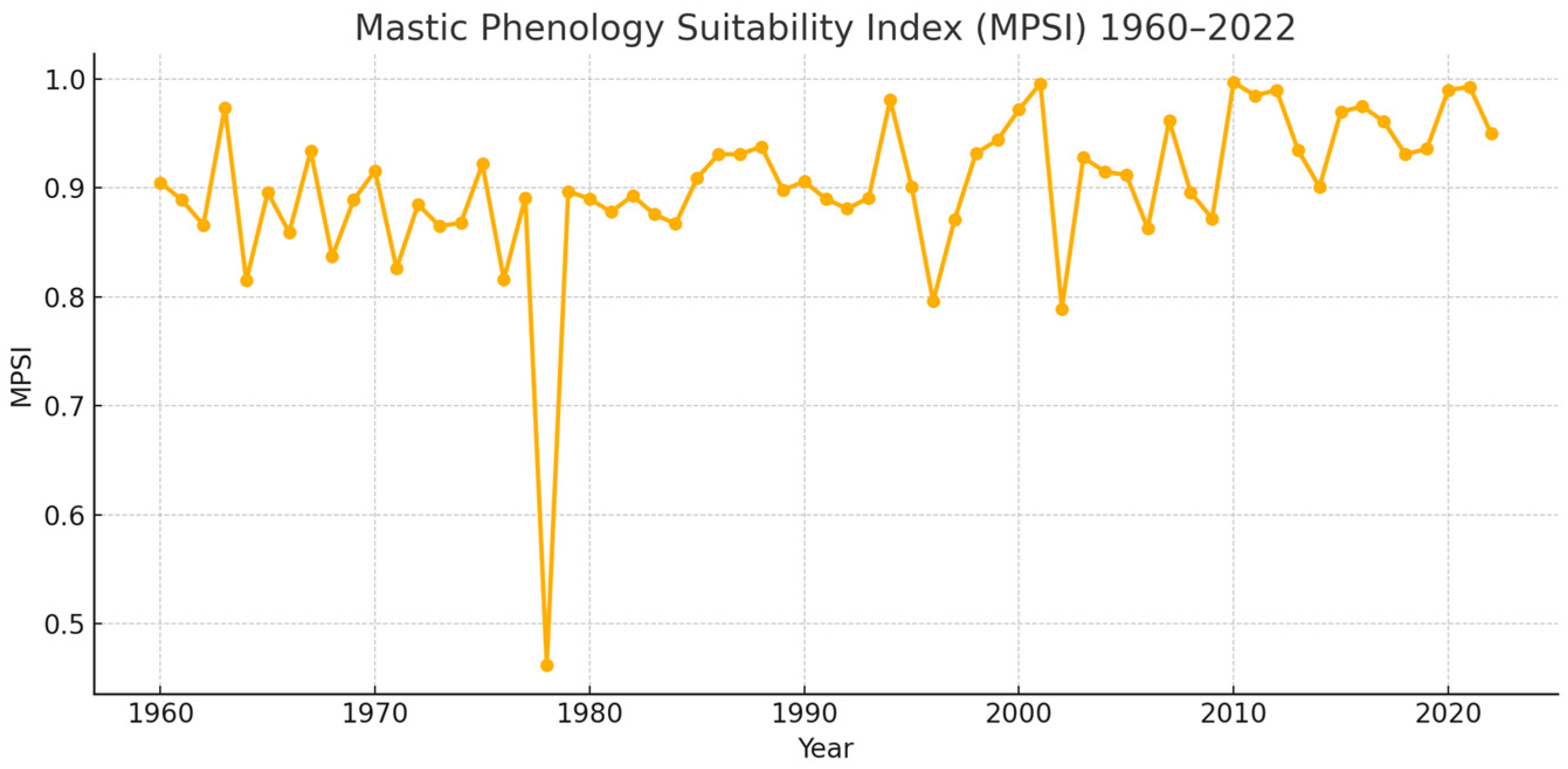 3.3.3. Development and Analysis of the Mastic Phenology Suitability Index (MPSI): 1960–2024