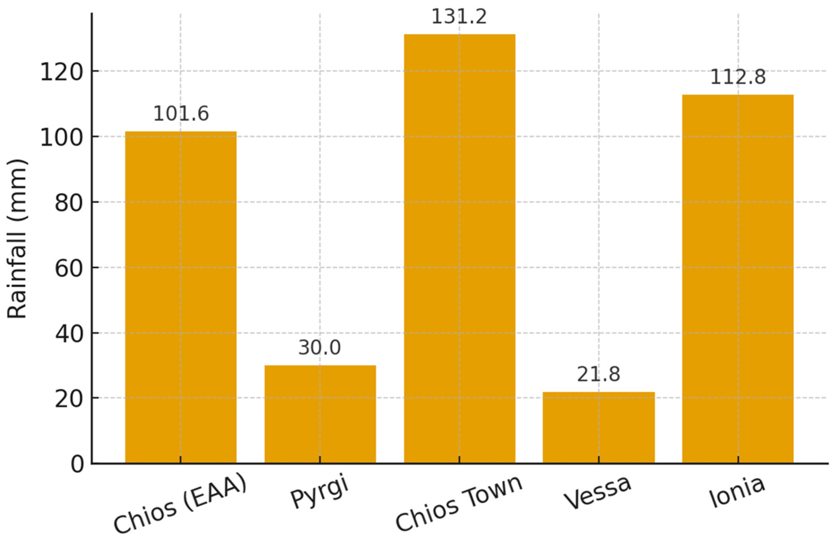 4.2. Extreme Rainfall and Climate Impact on Mastiha Cultivation—Chios, September 2024
