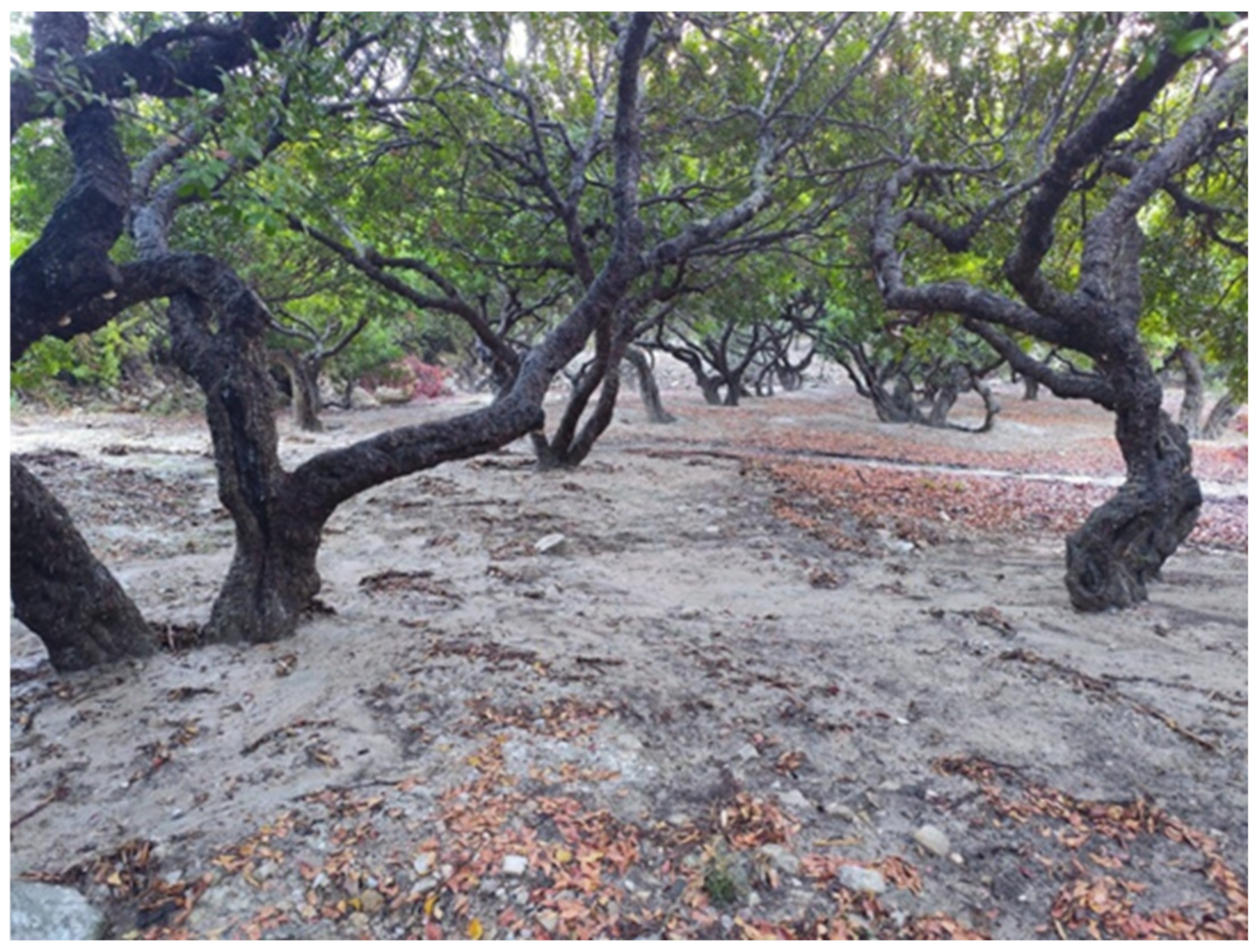 | Climatic Stressor | Critical Period | Observed or Potential Impacts on Mastic Gum Cultivation |