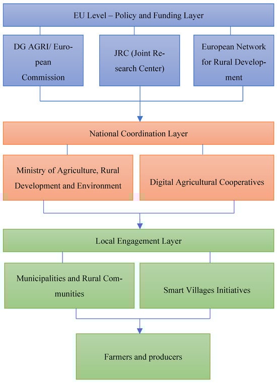 The development of digital agriculture in Cyprus does not take place spontaneously, but within a complex system of institutional coordination and information exchange. This process includes three levels of governance, European, national and local, which are interconnected through funding, regulation and feedback mechanisms. Digital innovations such as precision agriculture, smart irrigation and GIS mapping require a clear flow of data, from the strategic guidelines of the European Union, through the national institutions that implement them, to end users, producers and rural communities. The key assumption of this research is that digital agriculture becomes effective only when it is supported by institutional mechanisms that connect technical innovations with spatial and development policies. This enables the data collected at the local level (via sensors, satellites or digital services) not to remain isolated, but to be part of a wider decision-making system. The Cyprus model is based on the integration of Common Agricultural Policy (CAP) policies, technological projects implemented by the Agricultural Research Institute (ARI), and initiatives of local communities gathered in Smart Villages networks. This multi-layered system enables technological and regulatory innovations to be transferred from EU strategic documents to everyday practice in rural areas. Figure 4 shows how data, resources and decisions move between the three institutional levels and how a feedback loop is formed between policy, science and practice. Each level has a specific function and a set of institutions, but their connection is crucial for achieving a sustainable digital transformation of agriculture.