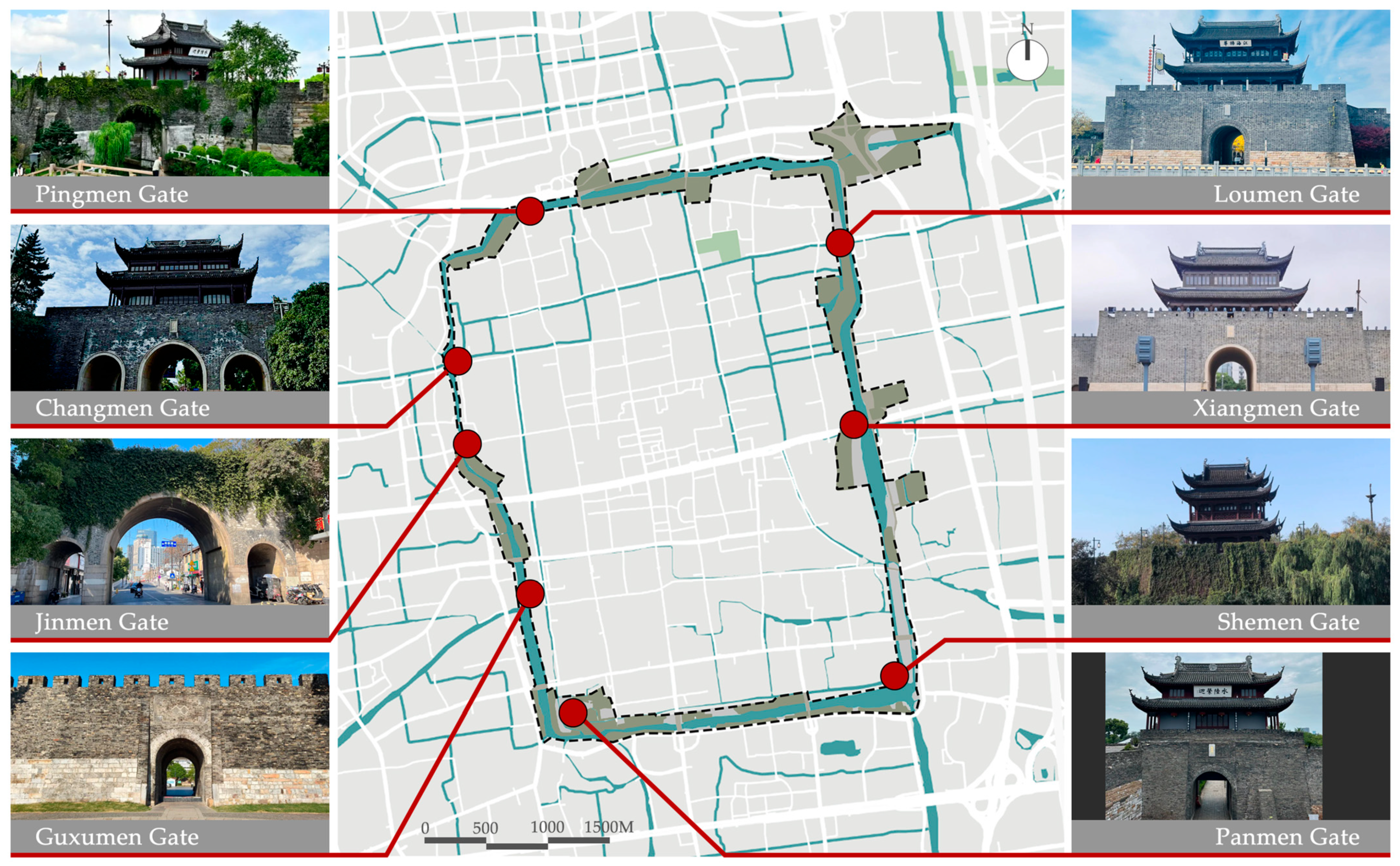 - Huang, Y.; Yang, S. Spatio-temporal evolution and distribution of cultural heritage sites along the Suzhou canal of China. Herit. Sci. 2023, 11, 188. [Google Scholar] [CrossRef]