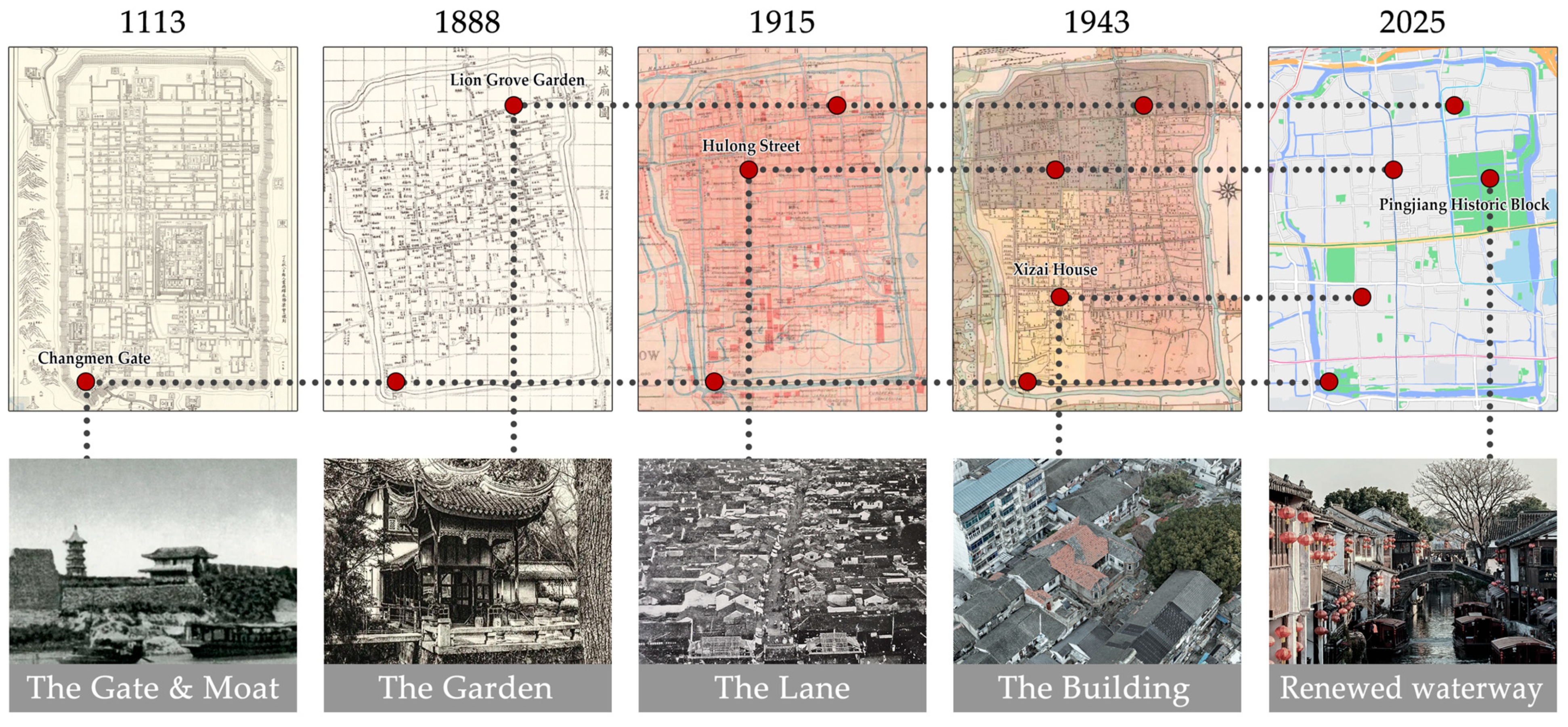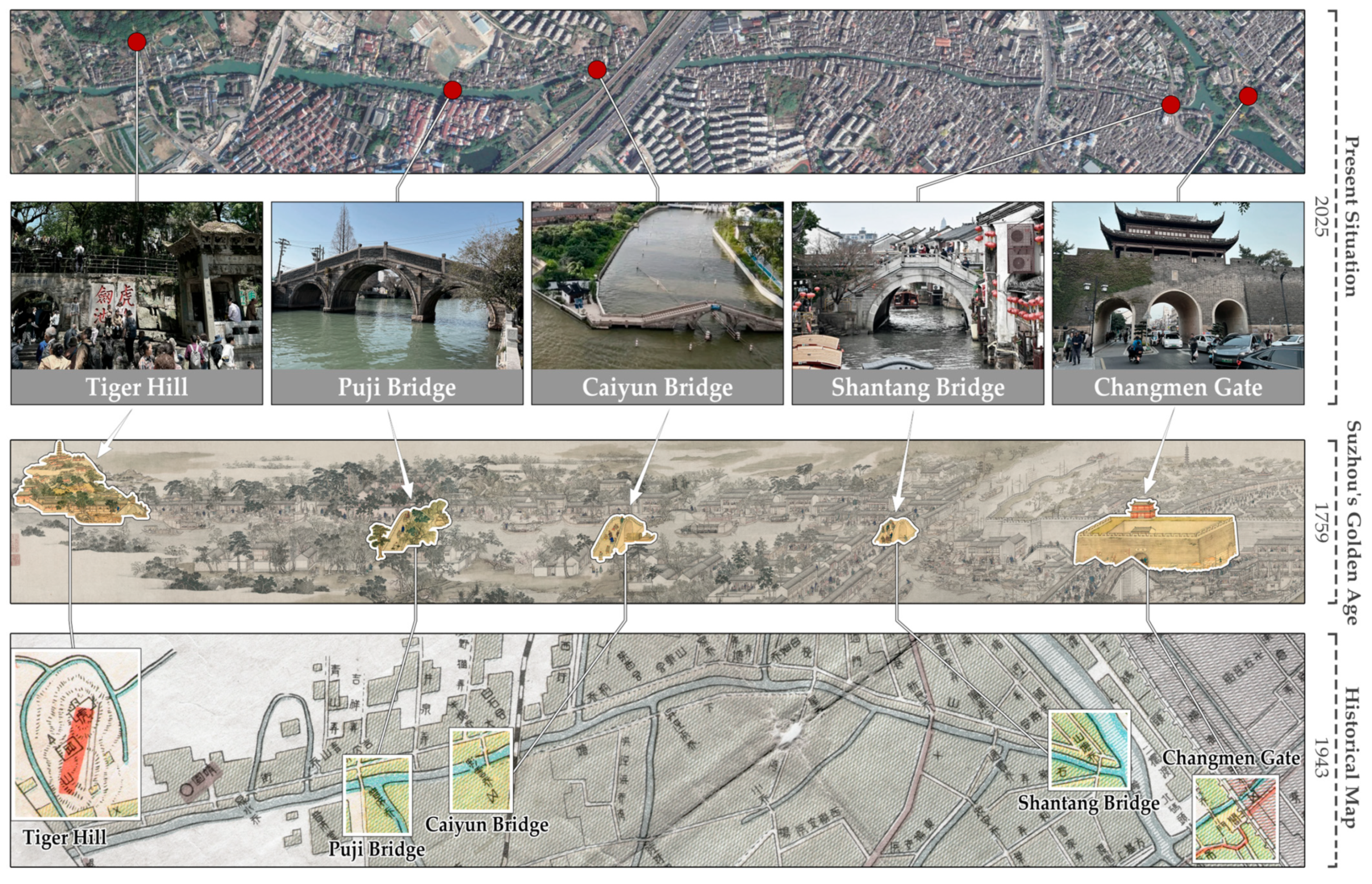 | Time | Historical Stratification (Structural Analysis) | Trace the evolution of water and land systems across different eras (e.g., the canal system of the Tang and Song dynasties, the expansion of market towns during the Ming and Qing dynasties, and the industrial transformation in modern times) |