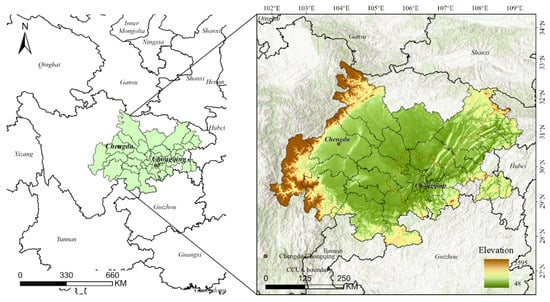The CCUA is located in the western part of China, which is the strategic intersection hub of the Yangtze River Economic Belt and the Belt and Road Initiative (BRI). As the core ecological barrier in the upper reaches of the Yangtze River, the region features complex topography spanning plains, hills, and mountains, with significant climatic diversity and rich ecosystems, combining high ecological sensitivity and potential for economic development. However, rapid urbanization has led to disorderly land expansion and spatial fragmentation, resulting in intensified human–land conflicts and increased ecological vulnerability. As the core growth pole of the western region, with a population of nearly 100 million and GDP exceeding CNY 60 trillion [22], its land use and sustainable development paths are of key significance in balancing regional development and environmental protection. Therefore, this study focuses on 15 prefecture-level cities in Sichuan Province and 29 districts and counties in Chongqing Municipality, as illustrated in Figure 1, to provide a scientific basis for the optimal allocation of land resources in ecologically sensitive urban agglomerations by analyzing the coupled and coordinated mechanisms and spatial-temporal evolution laws of the economic, social, and ecological benefits of land use.
