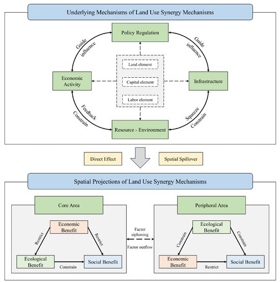 This study advances the understanding of land-use synergy in complex urban agglomerations through an integrated framework connecting spatial patterns, processes, mechanisms, and policy. Theoretically, it refines the core–periphery model by identifying a pattern of local optimization alongside regional fragmentation, highlighting the dual role of institutional factors as both enablers and constraints. Methodologically, it demonstrates how spatial econometric modeling combined with coupling coordination analysis can distinguish local effects from spatial spillovers. Practically, it proposes three actionable policy pillars: dynamic performance zoning, a hybrid ecological compensation system, and a cross-jurisdictional governance council, offering a spatially adaptive roadmap for sustainable planning. Future research should extend temporal analysis to capture full policy cycles, incorporate quantified institutional variables into spatial models, and develop coupled socioecological models to simulate long-term synergy under different governance scenarios.