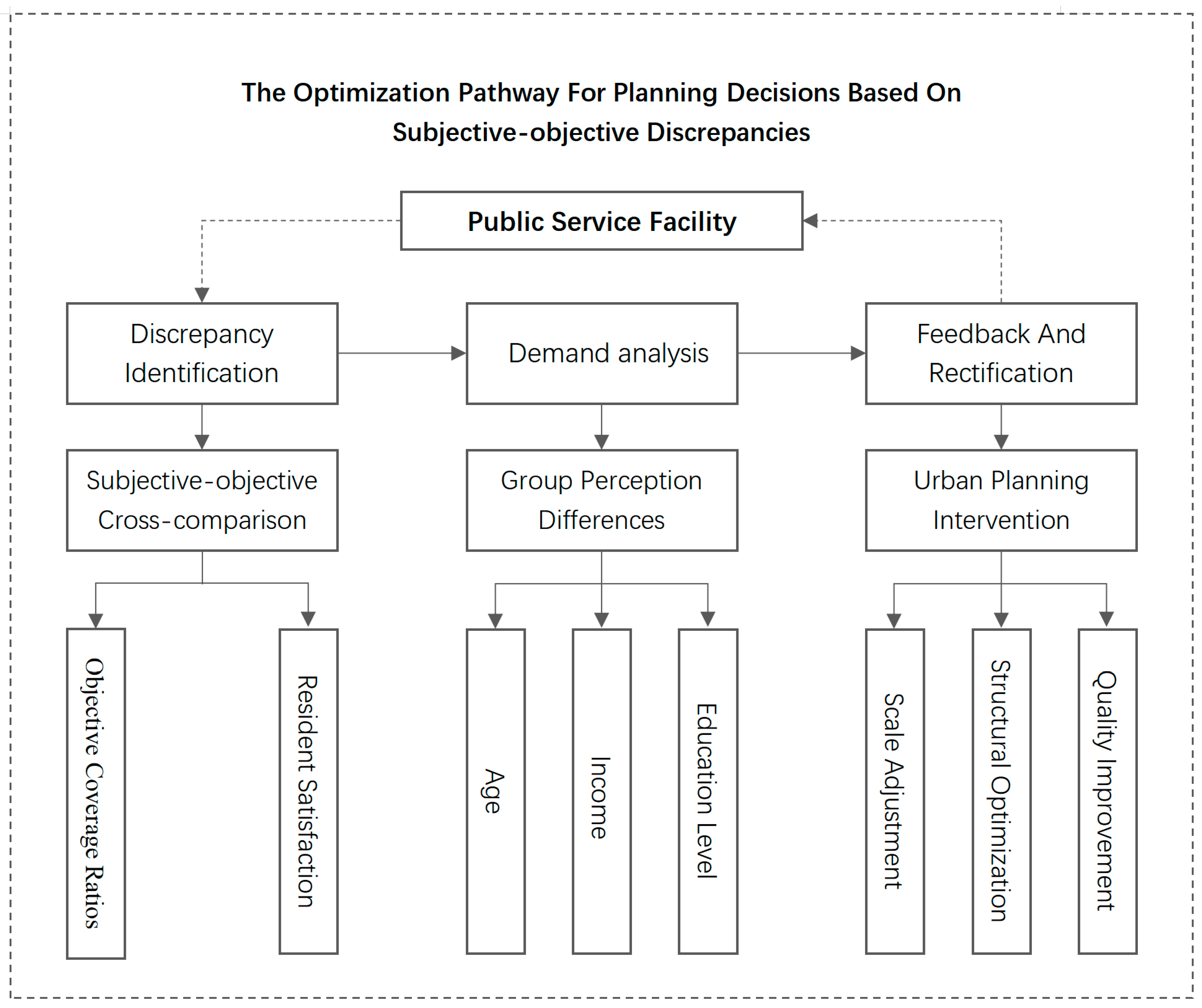 Figure 1. This mechanism follows a three-stage optimization pathway: “Discrepancy Identification → Demands Analysis → Feedback and Rectification.” By systematically fusing subjective data with objective indicators, this framework enables a significant leap in the precision of resource allocation. It achieves this by integrating decision-making logic and datasets, expanding the range of participating stakeholders, and enhancing the responsiveness of the planning process, thereby ensuring a more accurate alignment between the supply of public resources and the actual demands of the community, as shown in