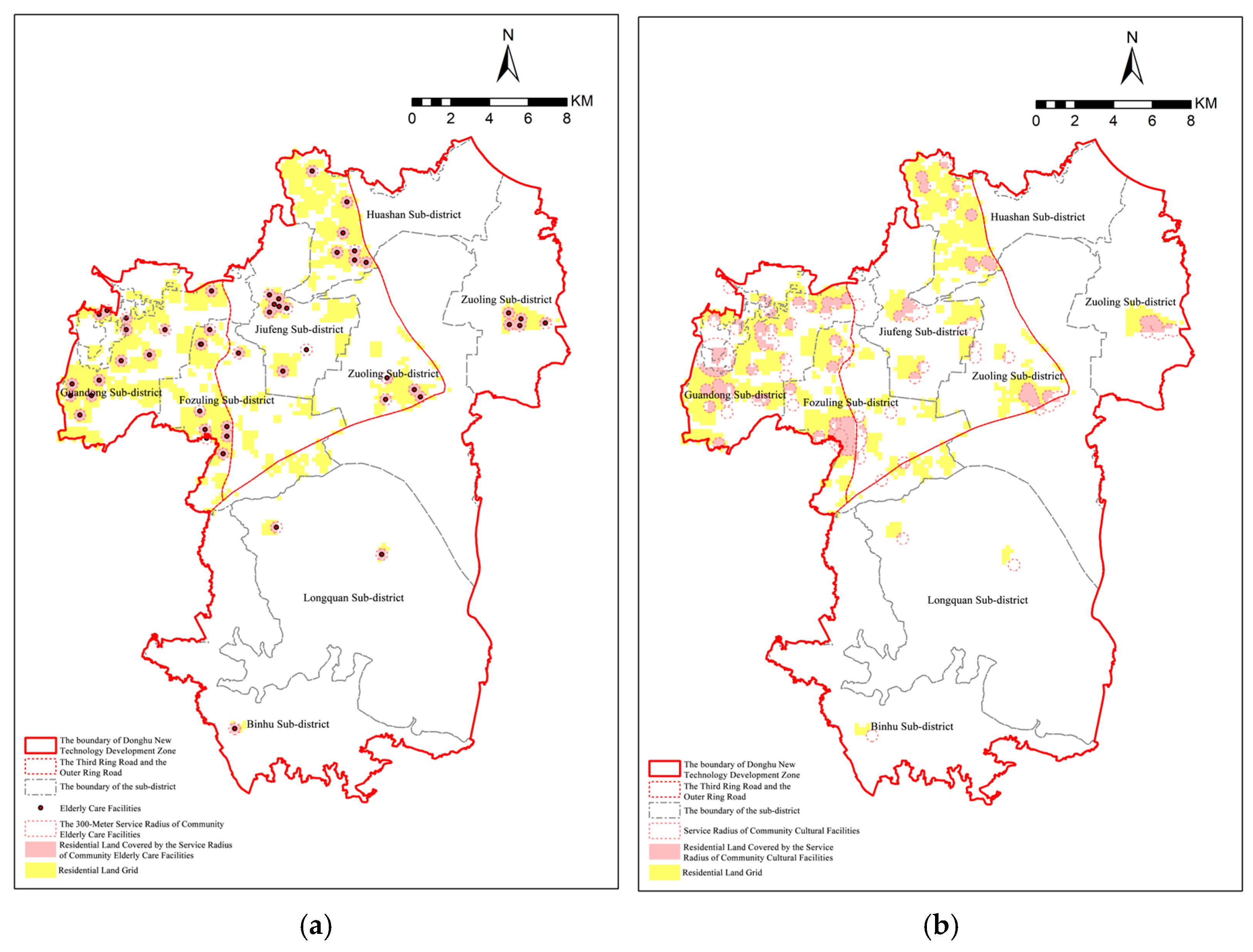 Table 6) reveals distinct spatial variations in these perception gaps. Guandong and Baoxie subdistricts show particularly large negative discrepancies, where resident satisfaction with elderly care and health facilities is significantly lower than what objective metrics would suggest. Similarly, Guandong, Baoxie, Fozuling, and Zuoling all report low satisfaction with cultural facilities despite relatively high objective coverage. This spatial heterogeneity suggests that subjective factors, such as differing public expectations, play a critical role in shaping these perception gaps.