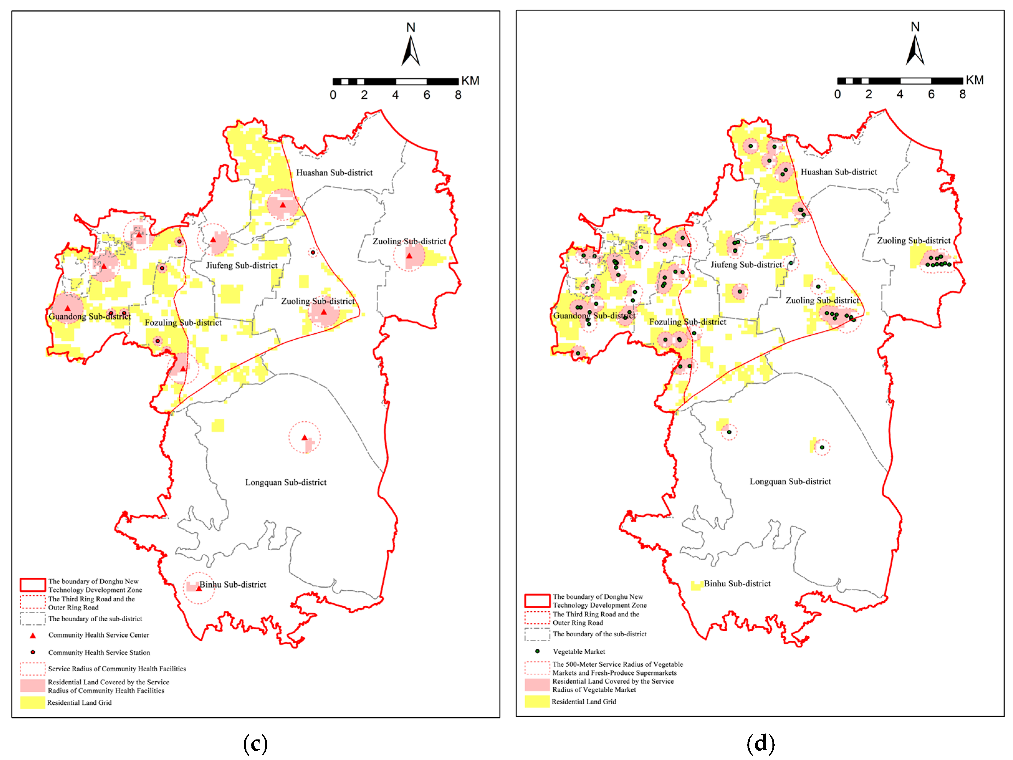 By statistically analyzing the survey responses regarding health services, elderly care facilities, fresh food markets (including fruit/vegetable retail and supermarkets), and cultural facilities, we quantified the subjective perception of these services in each subdistrict. The results in