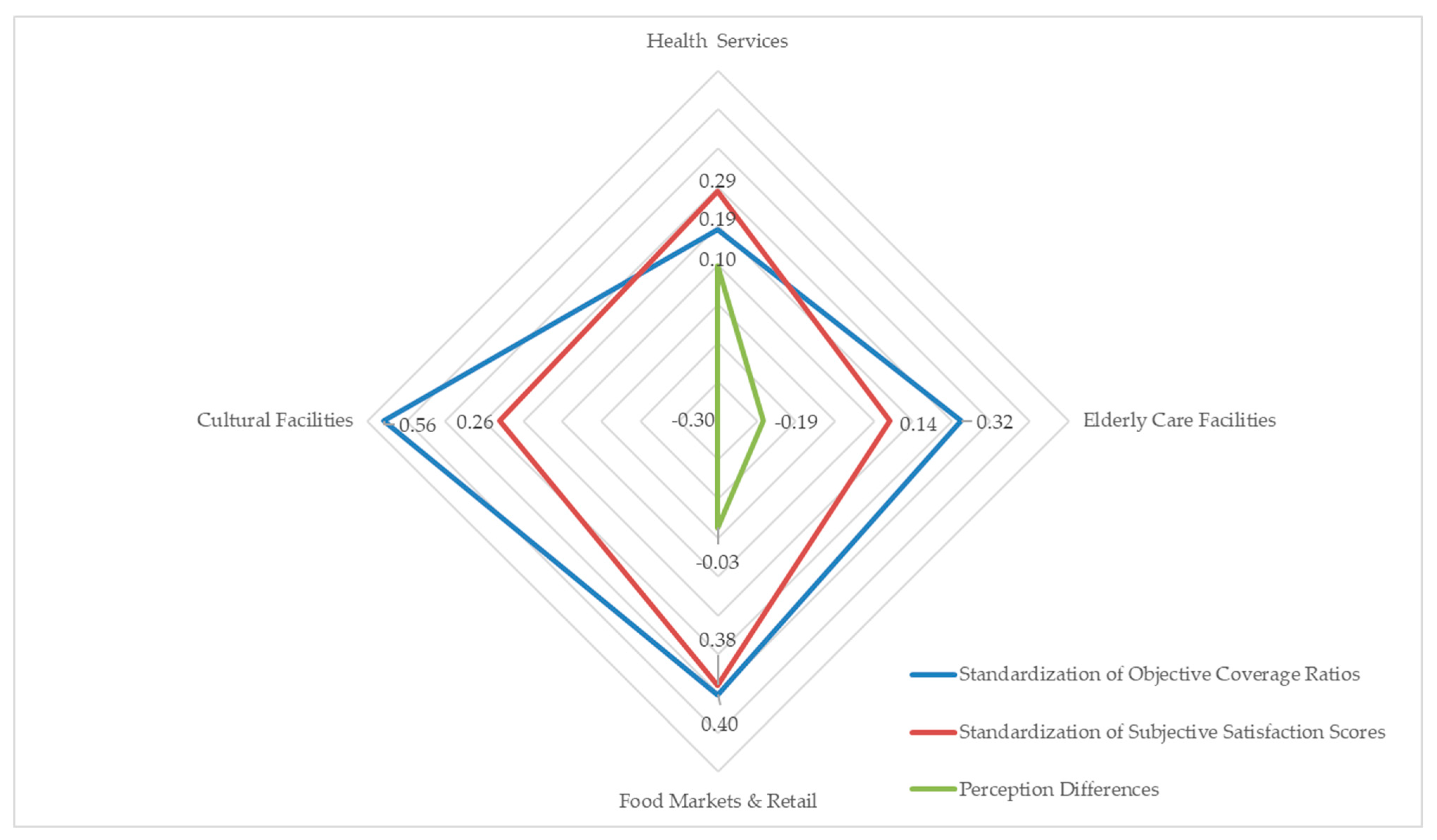 After normalizing both the subjective satisfaction scores and the objective coverage ratios, we calculated the discrepancy between them. Overall, significant disparities exist between subjective perceptions and objective supply in facility–service relationships, as shown in