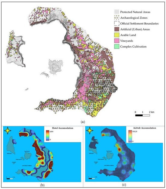 - Vegetation health and coverage, as captured by the Normalized Difference Vegetation Index (NDVI), are rapidly decreasing, with a more rapid pace of decrease observed in the central and southern parts of the island. These areas are also characterized by the shrinkage of agricultural land over the past three decades and a significant percentage of wider agricultural zones currently left uncultivated. The decrease in vegetation coverage in the central and southern parts is attributed to the fact that these areas have been the most heavily impacted by construction (artificial land; Figure 3a), followed by the northern part. In addition, large-scale tourism infrastructure, i.e., four- and five-star hotels with significant bed capacity, pools, and other auxiliary spaces, occupy large plots in the central and northern parts of the island (Figure 3b,c).