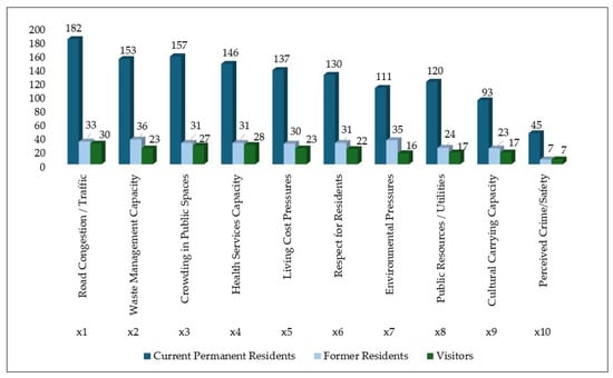 | Demographics/Profiling of Respondents | Q1–Q10 | Sex and age group; occupation; residency status (currently permanent and former residents); residency length (currently permanent and former residents); frequency of visit (visitors); municipal zone of residence (permanent residents); relation to the tourism-sector (employee or owner of tourism business). |