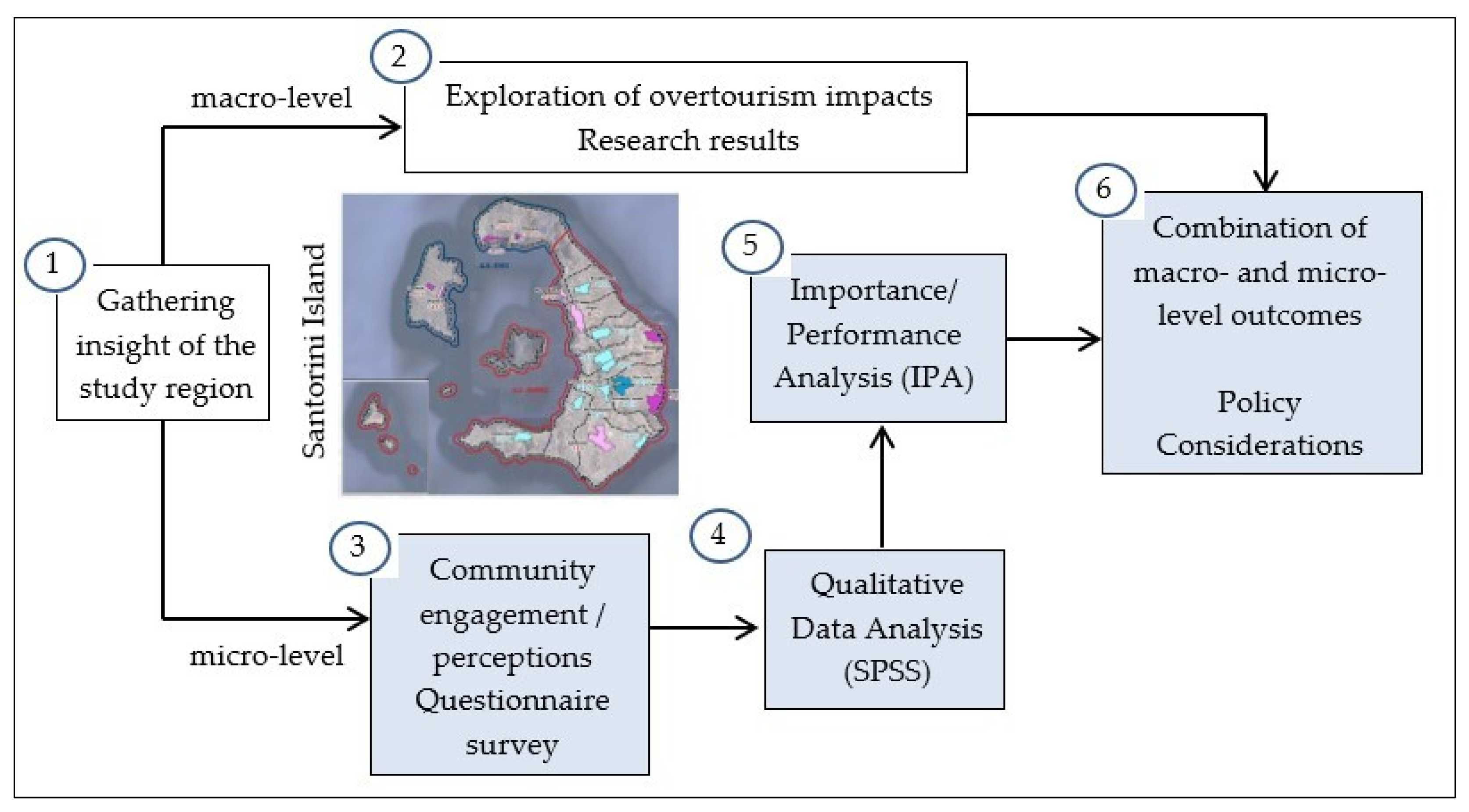 - Finally, in the last step (box 6), an attempt is made to roughly combine the work carried out at the macro- and micro-levels, which are perceived as complementary in highlighting issues that need to be incorporated into the policy discourse to articulate measures capable of mitigating overtourism impacts in Santorini Island.