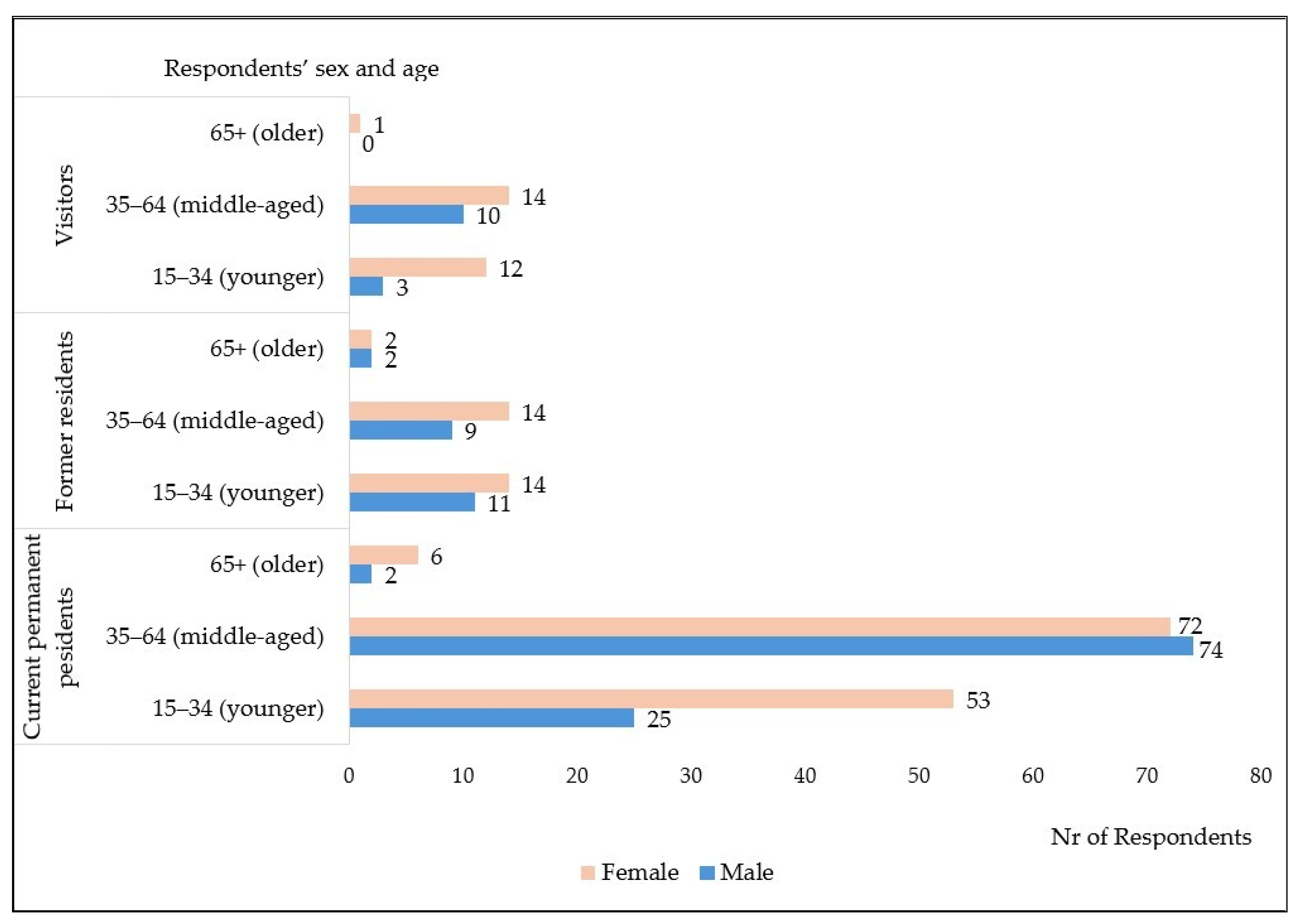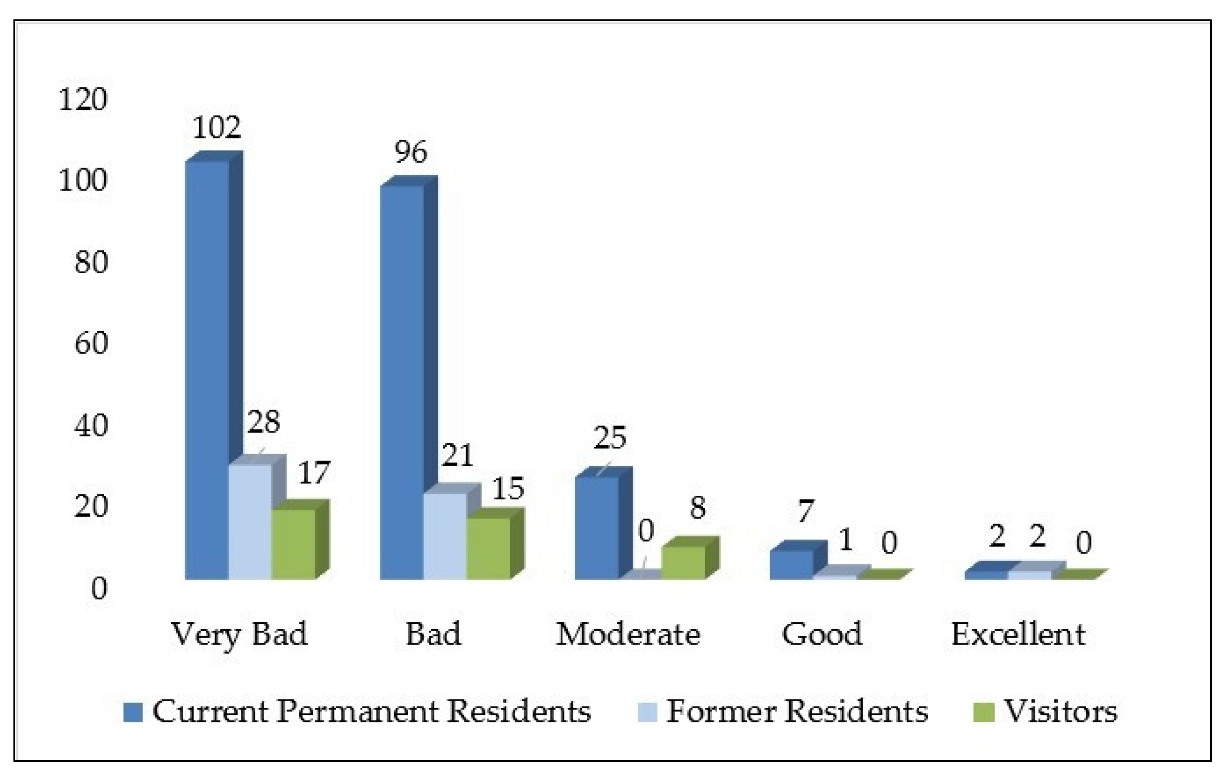 - Descriptive statistics: Frequencies and percentages were calculated for key demographic and contextual variables, including sex, age group, occupation, residency status (municipal zone and length of residence), and frequency of visit (for visitors).