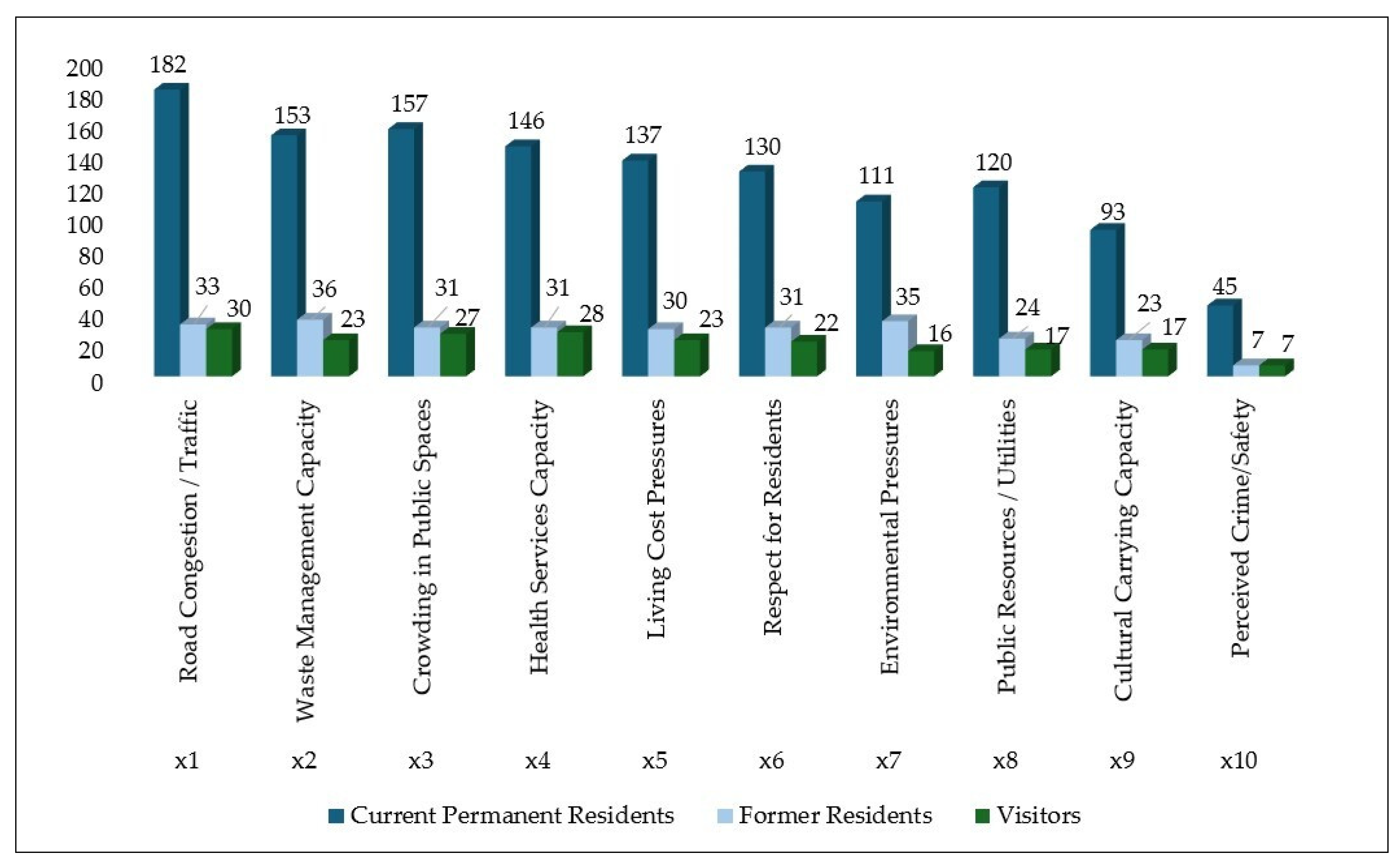 | Pressures/Problems that are due to (Over)Tourism | Q16 | Residents: congestion; waste management capacity; crowding; health infrastructure; living costs; environmental stress; concern for local identity. |