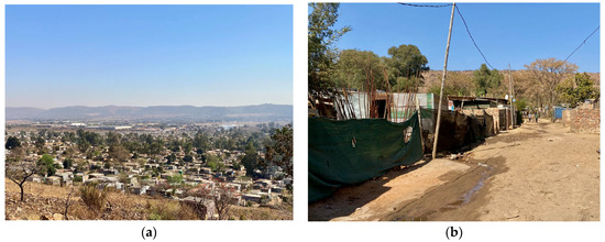 The study area, the Melusi informal settlement, located in Tshwane, in the Gauteng province of South Africa. (a) The Melusi informal settlement features densely grouped dwellings built from corrugated iron, timber, plastic coverings, and various reclaimed materials with narrow, unpaved streets. (b) Melusi residents are exposed to flooding, dust and extreme heat. (Source: Botes, 2024 [68]).