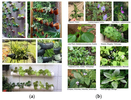 The photo-elicitation documents illustrating living wall systems (a) and African Vegetables (b) to the Melusi community during the 2023 surveys. (Source: De Kock, 2023 [73]).