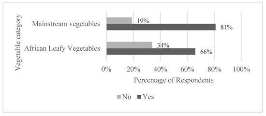 From the interviews and focus groups we verified that vegetables are a crucial component of the meals provided, with 90% of ECDs and youth centres including them daily. Nearly all respondents (94%) consume vegetables, with 66% purchasing from shops and 34% from markets or vendors, while ECDs and youth centres mainly sourced vegetables from local gardens. Over half of the ECDs and youth centres (60%) were familiar with AVs. However, mainstream vegetables were preferred, with 81% of respondents consuming them compared to 66% consuming AVs (refer to Figure 4). Staff from ECDs and youth centres indicated that most of the youth are open to eating AVs.