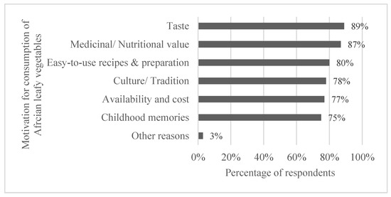 From the interviews, we verified that the conventional vegetables consumed included tomatoes, green beans, pumpkin, butternut, beetroot, cabbage, carrots, and spinach. African leafy vegetables mentioned during interviews included morogo (African spinach, made from amaranth, cowpea, and pumpkin leaves), gushe (Jute mallow), tseepe/thepe (Amaranth), spider plant (African cabbage), blackjack, and moringa. Motivations for consuming AVs included their nutritional value (87%), ease of preparation (80%), cultural significance (78%), affordability (77%), and associations with childhood memories (75%) (See Figure 5).