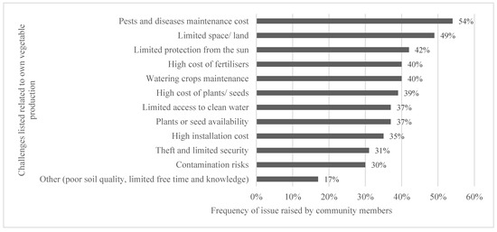 Community members identified high costs and resource management as the chief obstacles to cultivation. High maintenance costs (54%) were cited as the main barrier, stemming primarily from expenses related to pest control, fertilizers and water. Following this were physical constraints such as limited space and the need for sun protection. Further challenges included the cost and availability of seeds, as well as security and contamination risks (refer to Figure 7).