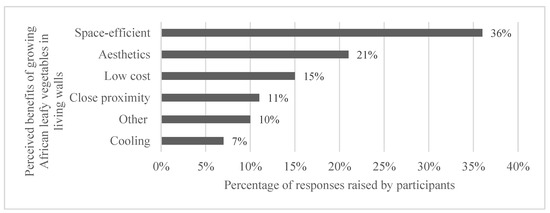 From the interviews with the community, we verified that most participants (72%) expressed interest in using LWSs as EGI for urban agriculture. However, participants raised concerns about the suitability of LWSs for certain crops, such as corn, which they deemed too large for the system. Additional reservations included the high implementation costs associated with LWSs. In contrast, participants favouring LWSs highlighted space-saving as the most significant advantage, a benefit also emphasized by ECDs (See Figure 9). Other benefits listed by participants include protection from animals, enjoyment, saving time and water, and the opportunity to use recyclable materials. Other benefits noted by ECDs and youth centres included the aesthetic appeal of LWSs and their positive impact on the well-being of staff and children through interaction with the system (See Figure 10).