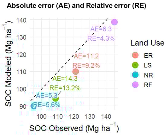 The comparison between observed and modeled soil organic carbon (SOC) under different land uses (ER, LS, NR, and RF) (Figure 3). The 1:1 dashed line indicates the ideal fit, while the plotted points highlight deviations across systems. The largest discrepancy occurred in LS, with an AE of 14.3 Mg ha−1 and an RE of 13.2%, indicating a tendency of the model to underestimate SOC in grazing systems. In contrast, RF showed the smallest deviation (AE = 6.3 Mg ha−1; RE = 4.3%), suggesting a robust fit under forest conditions. Intermediate errors were observed in ER (AE = 11.2 Mg ha−1; RE = 9.2%) and NR (AE = 5.3 Mg ha−1; RE = 5.6%). Overall, these results demonstrate that the model reliably captured SOC dynamics across land uses, although performance varied depending on vegetation cover and management (Figure 3).