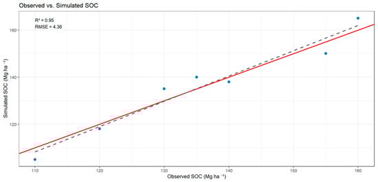 Relationship between observed and simulated soil organic carbon (SOC) values across land-use systems (RF, ER, NR, and LS). Blue dots represent observed SOC values. The solid red line represents the linear regression fit, and the dashed grey line indicates the 1:1 relationship. Model performance is summarized by the coefficient of determination (R2) and the root mean square error (RMSE).