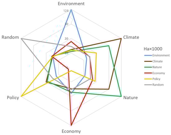 Results of the pairwise analysis illustrated by the spatial co-occurrence between one of each targeted indicator and the other four indicators separately (Environment = blue, Climate = brown, Nature = green, Economy = red, Policy = yellow). Note that the outer axis scale jumps from 30,000 to 128,000 ha for better visualization.