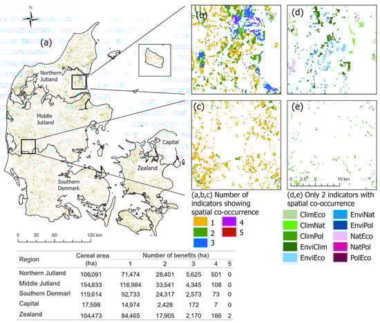 The national geographical distribution of agricultural fields where 1, 2, 3, 4, or 5 indicators show spatial co-occurrence when selecting the most suitable area to initiate the alternative beef system: (a) the national map, (b–e) zoomed-in examples. The table shows regional statistics. Boxes show the Danish island Bornholm located in the Baltic Sea.