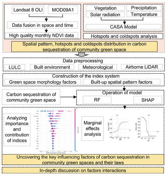 Research framework for revealing the relationship between urban built-up spatial patterns, green space morphology and spatial heterogeneity of carbon sequestration at the community scale.