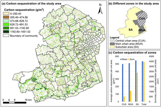 Spatial pattern of carbon sequestration in the study area: (a) carbon sequestration in the study area; (b) different zones within the study area: central urban area (CUA), main urban area (MUA) and suburban area (SA); (c) comparison of carbon sequestration capacity and total carbon sequestration between different zones.