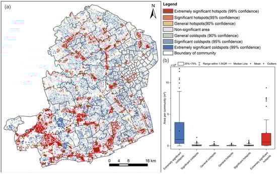 Map of the spatial pattern of carbon sequestration coldspots and hotspots in the study area (a); the area per community of the different levels of coldspots and hotspots (b).