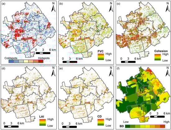 Spatial distribution map of carbon sequestration coldspots and hotspots (a) of the selected typical communities, along with spatial distribution maps of key indices including fractional vegetation cover (FVC) (b), cohesion (c), leaf area index (LAI) (d), canopy density (CD) (e) and building density (BD) (f).