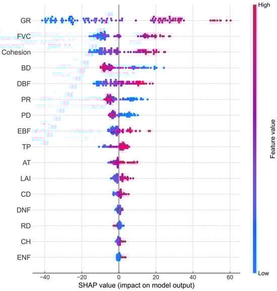 Contribution of factors affecting carbon sequestration in green spaces in urban communities. The x-axis shows the Shapley Additive exPlanations (SHAP) values, indicating the positive and negative contributions of different influencing factors with green space carbon sequestration capacity. The y-axis shows the importance of these influencing factors. The colours of the data points, blue and red, correspond to low and high values of the predictions, respectively.