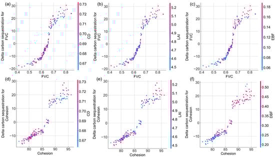 Partial factor bivariate dependency plot for the green space morphology factors influencing carbon sequestration. For each interaction subplot: the x-axis represents the values of the primary green space morphology feature; the y-axis denotes the delta carbon sequestration (the change in predicted carbon sequestration relative to the average SHAP value of the corresponding primary feature); the colour of the points indicates the value range of the secondary feature. Individual subplot descriptions: (a) Primary feature: FVC; Secondary feature: CD; (b) Primary feature: FVC; Secondary feature: LAI; (c) Primary feature: FVC; Secondary feature: EBF; (d) Primary feature: cohesion; Secondary feature: CD; (e) Primary feature: cohesion; Secondary feature: LAI; (f) Primary feature: cohesion; Secondary feature: DBF.