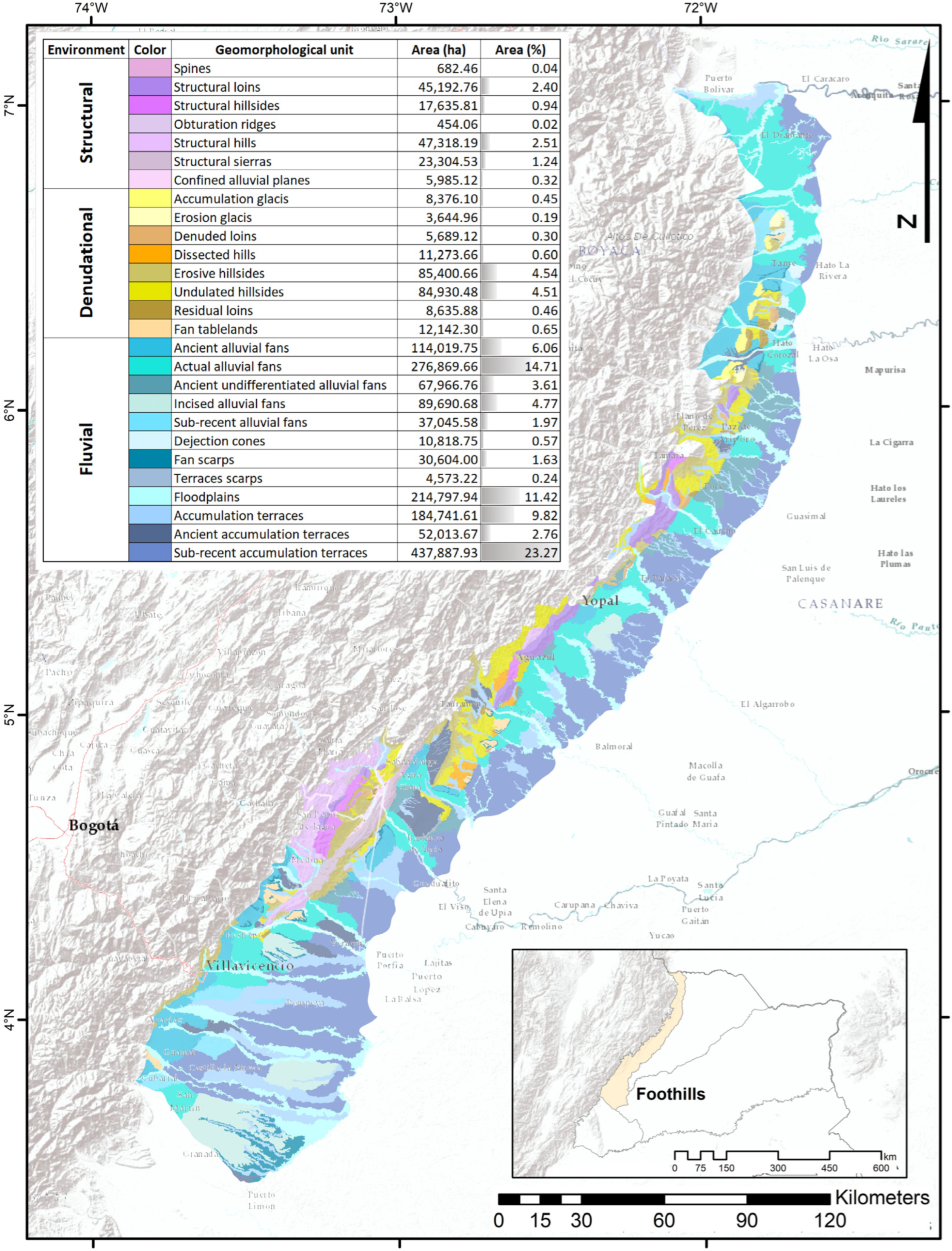 - Niño, L.; Jaramillo, A.; Villamizar, V.; Rangel-Ch, J.O. Geomorphology, Land-Use, and Hemeroby of Foothills in Colombian Orinoquia: Classification and Correlation at a Regional Scale. Pap. Appl. Geogr. 2023, 9, 295–314. [Google Scholar] [CrossRef]