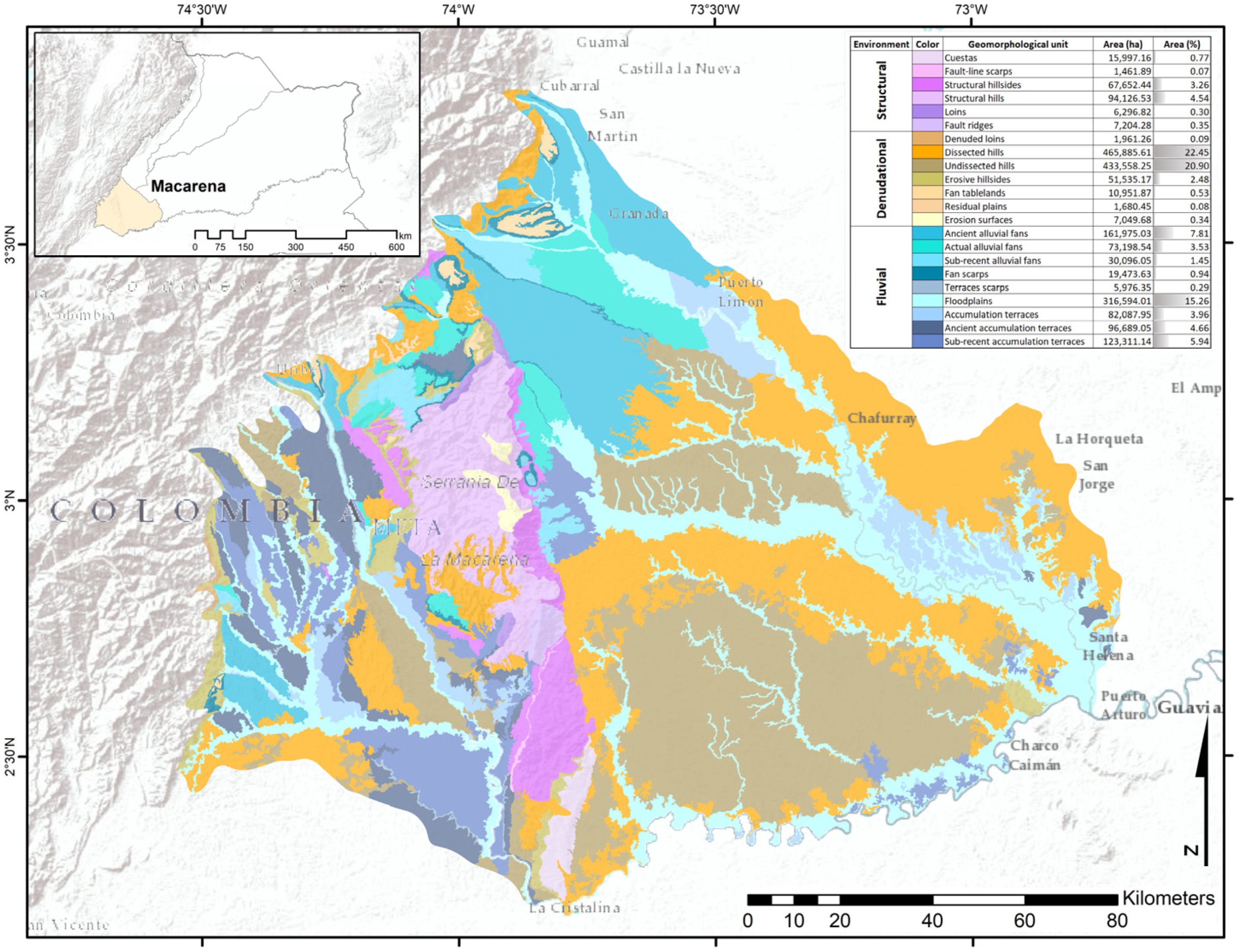 - Jaramillo, A.; Rangel-Ch, J.O. Las Unidades Del Paisaje y Los Bloques Del Territorio En La Orinoquia. In Colombia Diversidad Biótica XIV: La Región de la Orinoquia de Colombia; Rangel-Ch, J.O., Ed.; Universidad Nacional de Colombia: Bogotá, Colombia, 2014; pp. 101–152. ISBN 978-958-775-147-5. [Google Scholar]