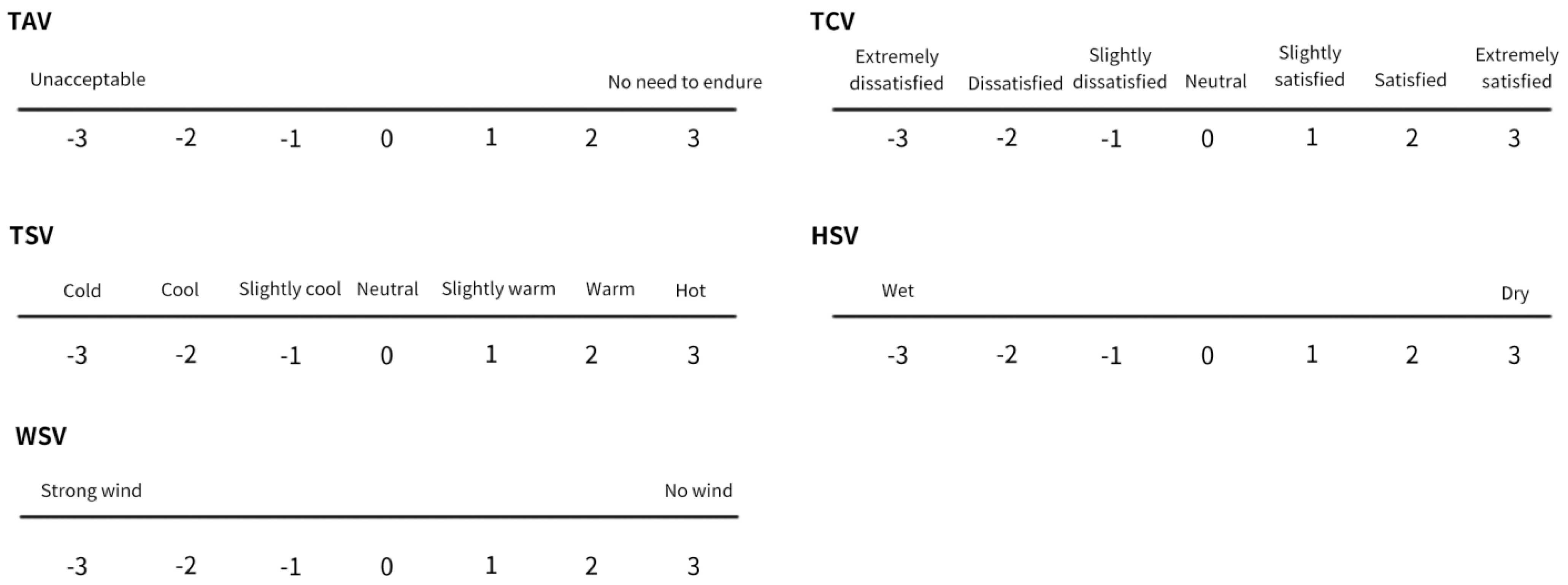 - Assessment of correlation trends: Pearson correlation coefficients (r) between the scoring values and the thermal comfort indicators TSV, TCV and TAV were first calculated. The direction and magnitude of r were used to determine the general trend of thermal comfort as scores increase, thereby identifying potential positive or negative associations.