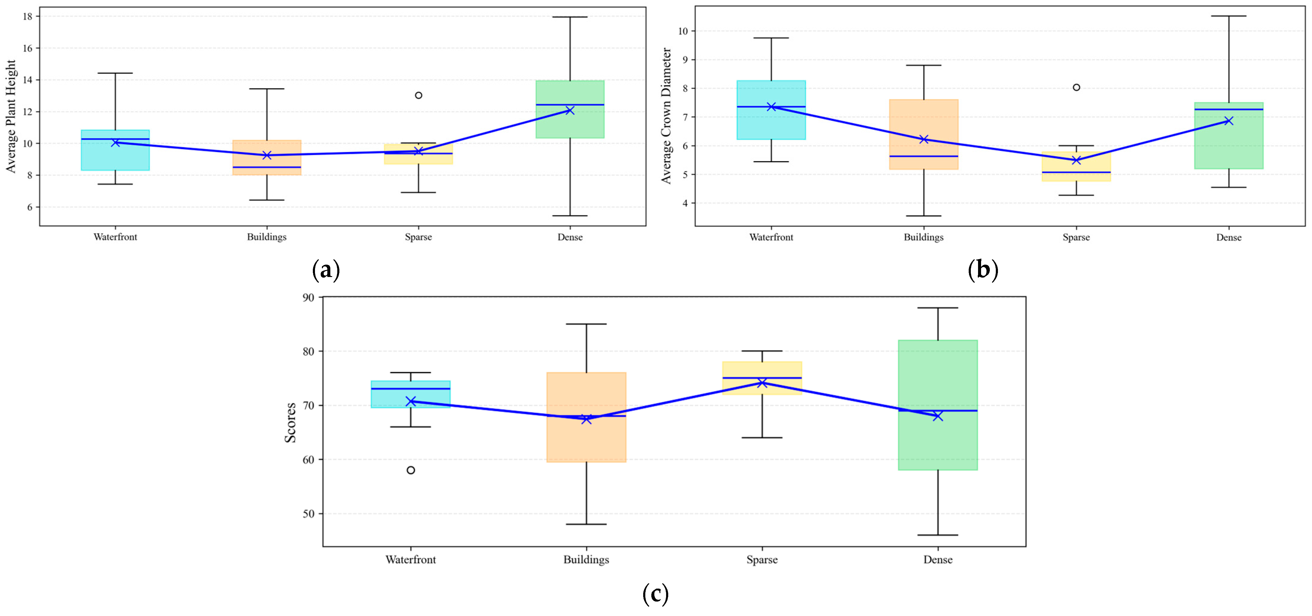 - Zhou, S.-Q.; Yu, Z.-W.; Ma, W.-Y.; Yao, X.-H.; Xiong, J.-Q.; Ma, W.-J.; Xiang, S.-Y.; Yuan, Q.; Hao, Y.-Y.; Xu, D.-F.; et al. Vertical Canopy Structure Dominates Cooling and Thermal Comfort of Urban Pocket Parks during Hot Summer Days. Landsc. Urban Plan. 2025, 254, 105242. [Google Scholar] [CrossRef]