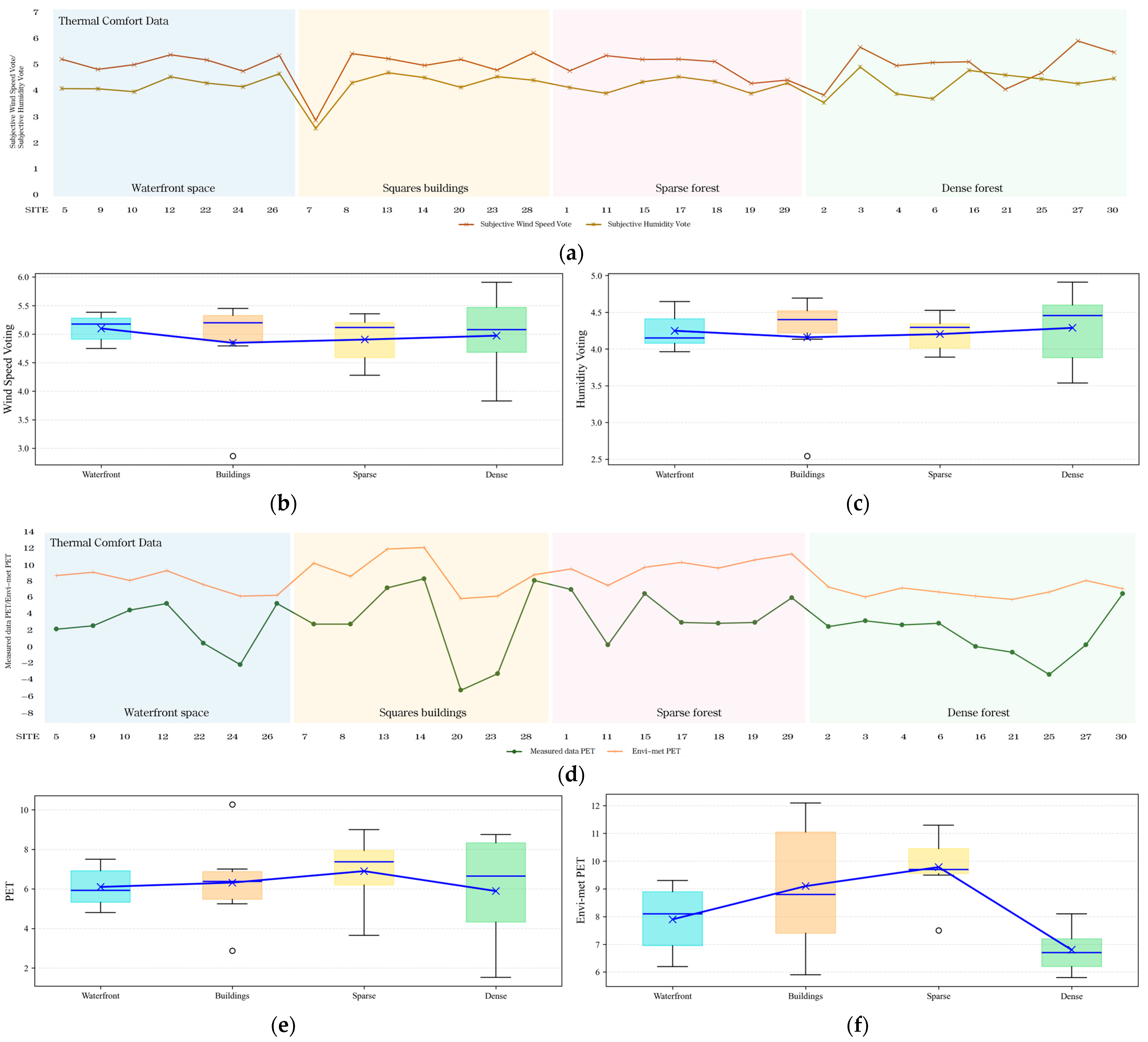 - Wind speed and humidity significantly influence seniors’ subjective and objective thermal comfort. However, differing plant compositions across landscape types create variations in perceived wind speed and humidity, thereby affecting seniors’ thermal comfort perception.