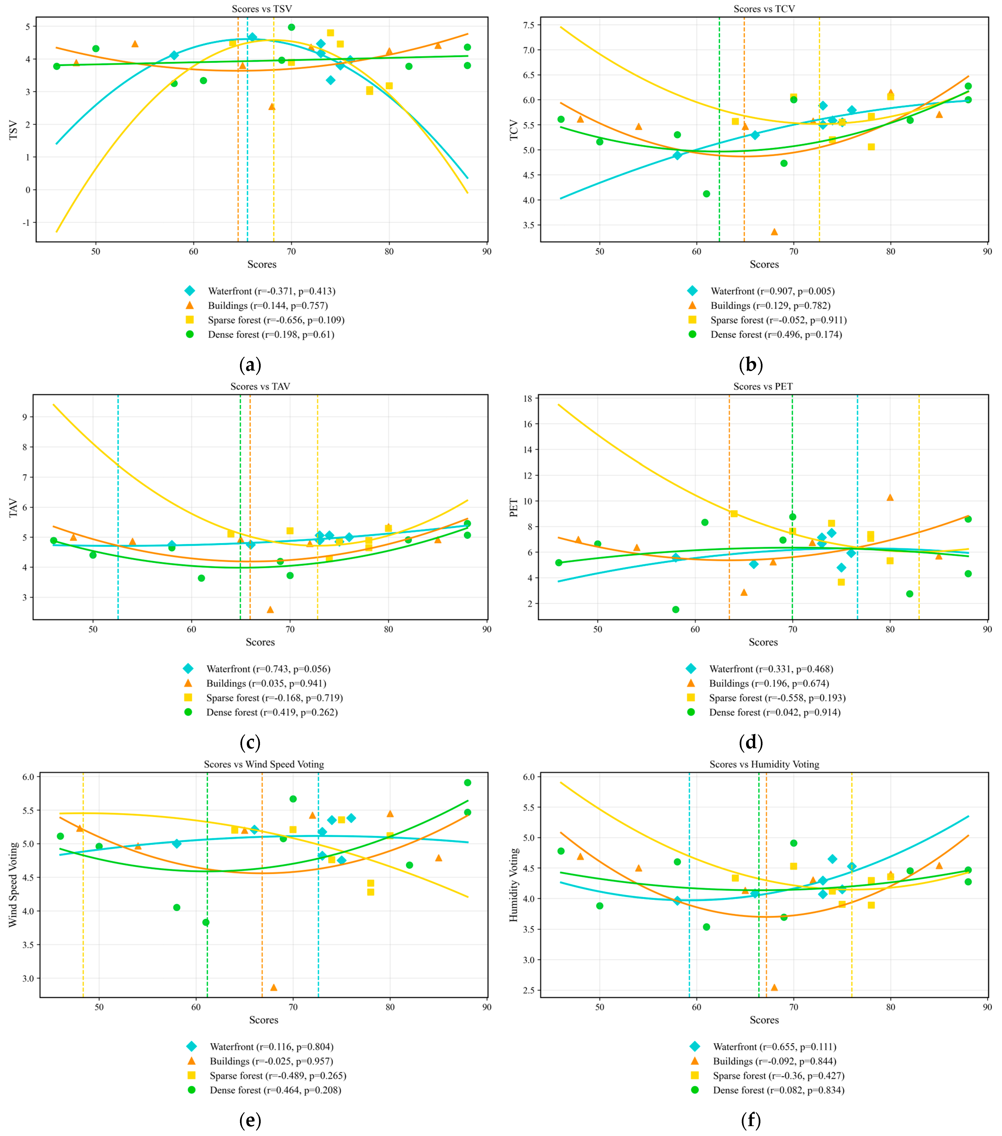 - Identification of the extremum in quadratic regression models: For each landscape type, a quadratic regression model was constructed between the scoring values and the thermal comfort indicators. The vertex of the model was taken as the theoretical point at which thermal comfort reaches its optimum within the corresponding score range. This extremum reflects the optimal or least favorable comfort tendency associated with score variation and serves as a key mathematical basis for determining the threshold. When the computed optimal score contained decimals, it was rounded to the nearest integer to maintain consistency with the integer-based scoring system.