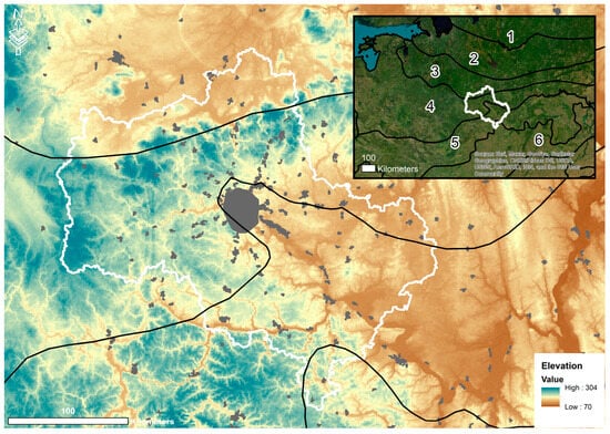 The Moscow region is located in the central part of the Eastern European (Russian) Plain—54°12′–56°55′ N, 35°10′–40°15′ E—covering an area of 4.43 million ha (excluding Moscow) (Figure 1). By its natural conditions, the Moscow region is crossed by several important natural and botanical–geographical boundaries that pass through the territory, caused by climate gradients and the heterogeneity of glacial and fluvioglacial deposits formed during Quaternary glaciations [39]. According to the Köppen climate classification, the territory belongs to the Dfb—Cold, no dry season, warm summer [40]. According to a schematic map of climate regions, the Moscow region is classified as a moderately continental area [41,42]. The mean annual air temperature is 2.7–3.8° C, and precipitation is 479–644 mm according to our regional averaging of Worldclim [43]. The terrain is gently rolling, with heights varying from 90 to 320, with an average of 174 m above sea level, and the mean slope is 2.06° (0–30.9°).