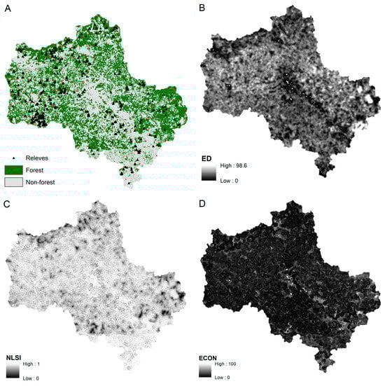 (A)—Forest and non-forest land cover; triangles indicate vegetation relevés locations. Fragmentation metrics of forest patches: (B)—Edge density (ED) metric, (C)—Edge contrast (ECON) metric, (D)—Normalized landscape shape index (NLSI) metric. Scale 1: 3,000,000.