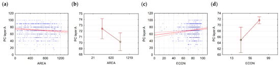 PC Layer A and AREA: (a)—scatterplot; (b)—means plot. PC Layer A and ECON: (c)—scatterplot; (d)—means plot; scatterplot explanations: blue dots—observations, solid red line—linear or quadratic fit, dashed red line—confidence interval 0.95; means plot explanations: middle point—mean, whiskers confidence interval 0.95.
