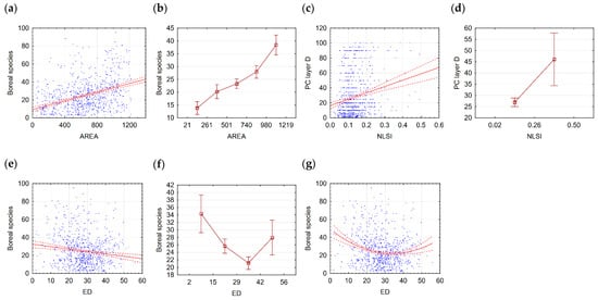 Boreal species and AREA: (a)—scatterplot; (b)—means plot. PC Layer D and NLSI: (c)—scatterplot; (d)—means plot. Boreal species and ED: (e)—scatterplot; (f)—means plot; (g)—scatterplot (quadratic); scatterplot explanations: blue dots—observations, solid red line—linear or quadratic fit, dashed red line—confidence interval 0.95; means plot explanations: middle point—mean, whiskers confidence interval 0.95.