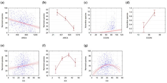 Nemoral species and AREA: (a)—scatterplot; (b)—means plot. Adventive species and ECON: (c)—scatterplot; (d)—means plot. Nemoral species and ED: (e)—scatterplot; (f)—means plot; (g)—scatterplot (quadratic); scatterplot explanations: blue dots—observations, solid red line—linear or quadratic fit, dashed red line—confidence interval 0.95; means plot explanations: middle point —mean, whiskers confidence interval 0.95.