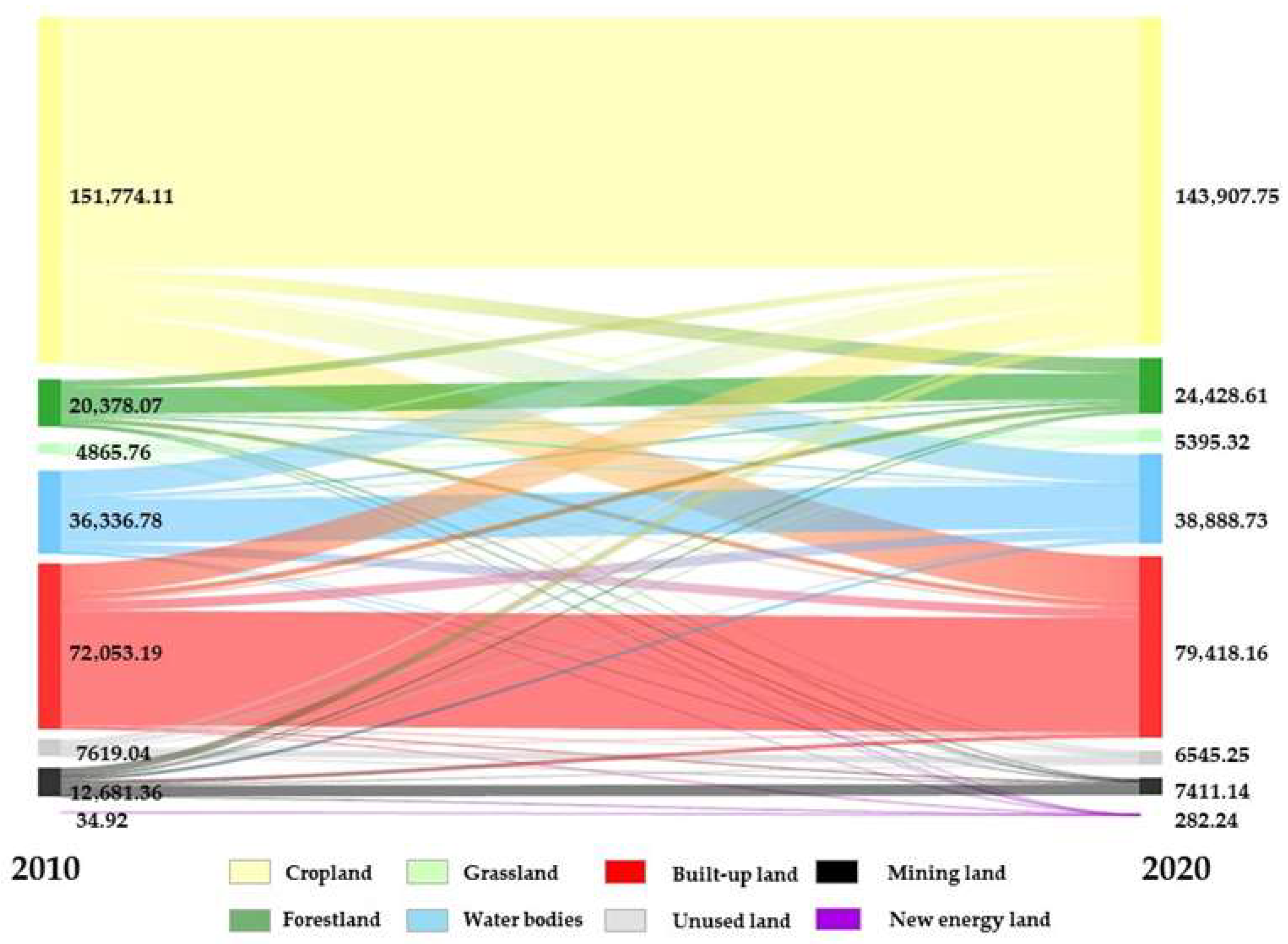 Overall, from 2010 to 2020, the cropland, mining land, and unused land were primarily net sources (converted to other categories), while the forestland, built-up land, grassland, and water bodies were primarily net sinks (increases in area via conversion from other categories). These patterns reveal a clear trend of urban expansion, ecological restoration of forest and grassland, and the gradual withdrawal of mining land, consistent with the region’s long-term development and land management policies.