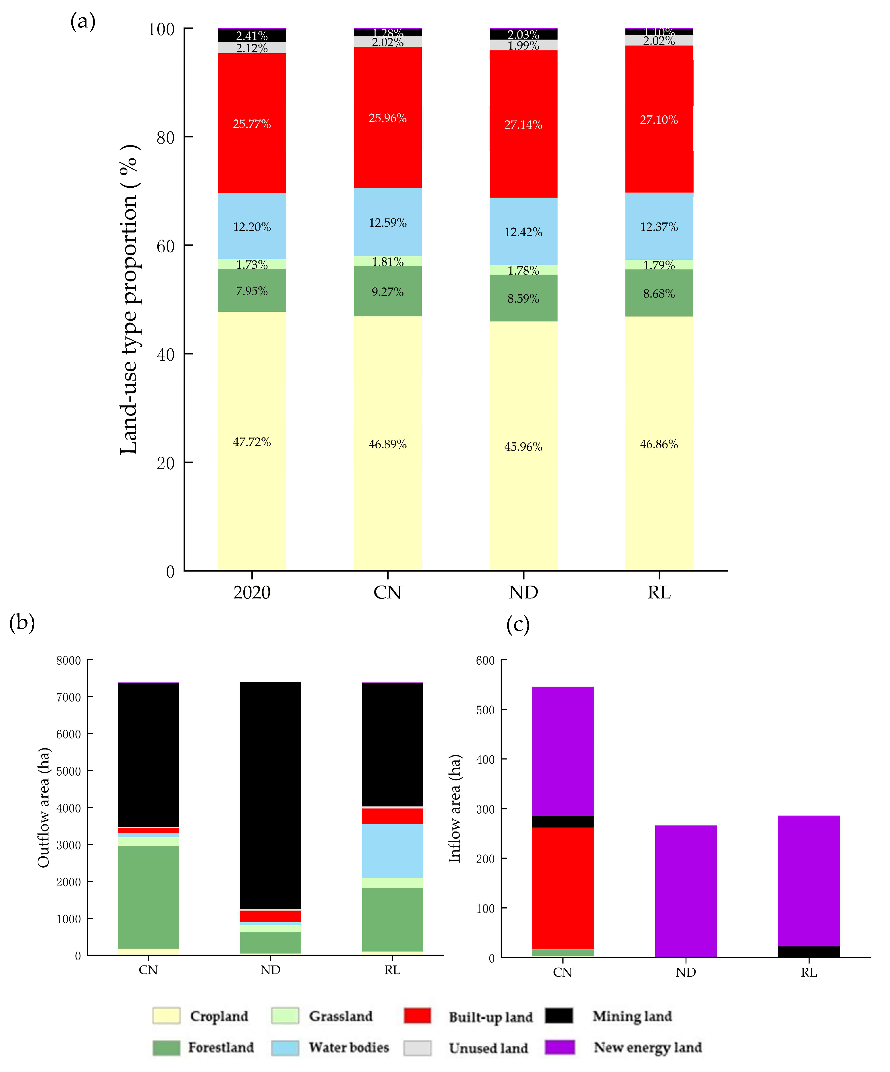 Figure 5a, cropland remains the dominant land category across all scenarios, with proportions ranging from 45.96% to 46.89% in 2030, slightly lower than 2020 (47.72%). Forestland shows a steady increase, with the CN scenario achieving the highest share (9.27%). Water bodies and grassland maintain relatively stable proportions with marginal increases. Built-up land expands notably under ND and LR (27.14% and 27.10%, respectively), while CN effectively restricts its growth (25.96%). Mining land experiences substantial shrinkage in all scenarios, particularly under LR (1.10%) and CN (1.28%), compared with 2.41% in 2020. New-energy land remains unchanged under ND and LR (0.09%) but doubles under CN (0.18%).
