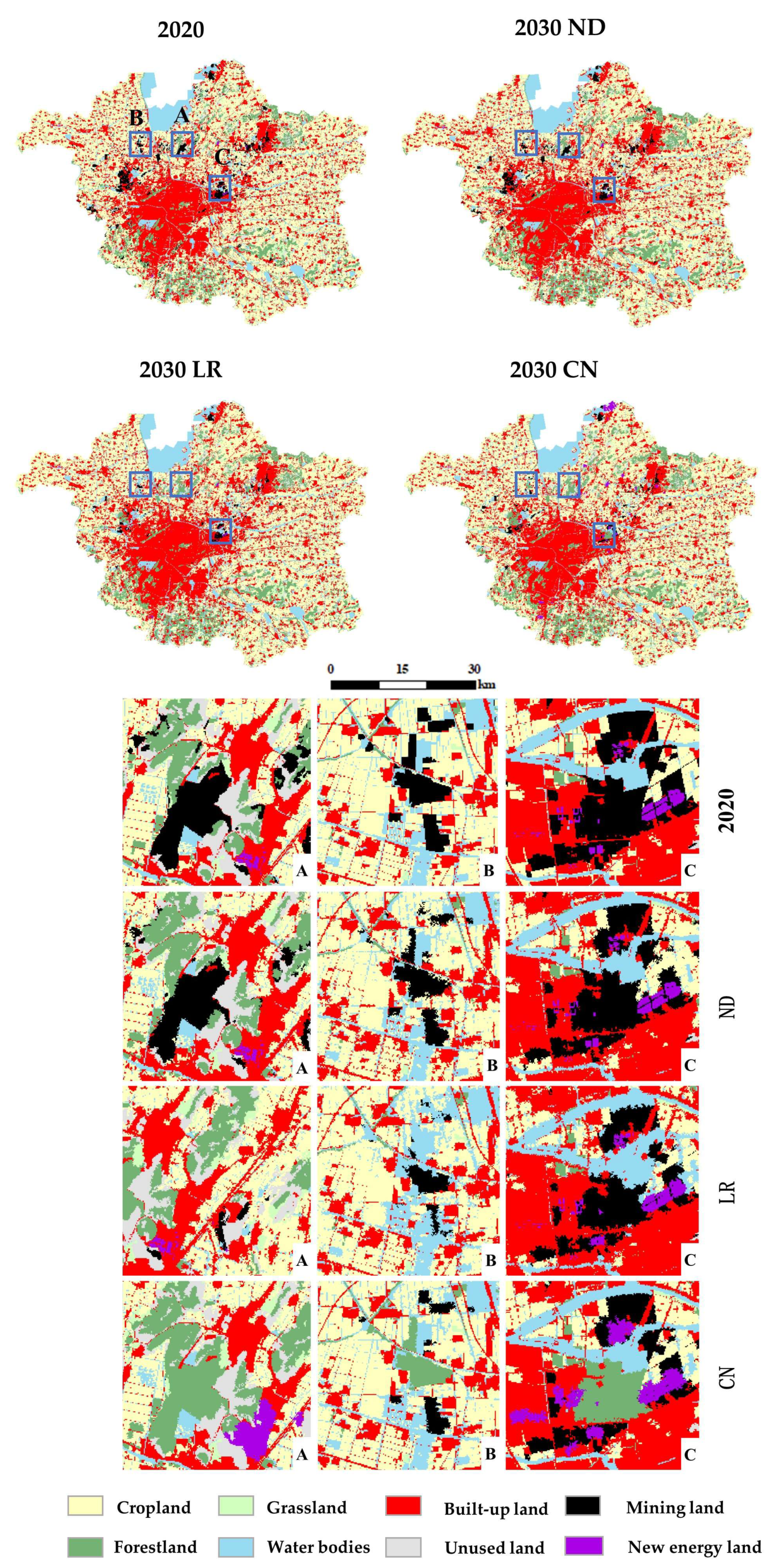 To address this gap, in this study, we took the mining areas in Xuzhou—a representative resource-exhausted city—as a case study. Based on land use data for 2010 and 2020, we applied the Geographical Simulation and Optimization System-future land use simulation model (GeoSOS-FLUS) model to simulate land use patterns in 2030 under three scenarios, namely, natural development (ND), land recovery (LR), and carbon neutrality (CN), and we combined an emission factor approach with a land use carbon inventory to evaluate net carbon emissions under each scenario. The objectives of this study were to (1) assess how the different scenarios affect the land use structure; (2) characterize the spatiotemporal patterns of the land use carbon emissions under multiple scenarios; and (3) elucidate the driving role of carbon neutrality strategies in land use transition, thereby providing scientific support for the low-carbon transition process and sustainable development of coal resource-exhausted cities.